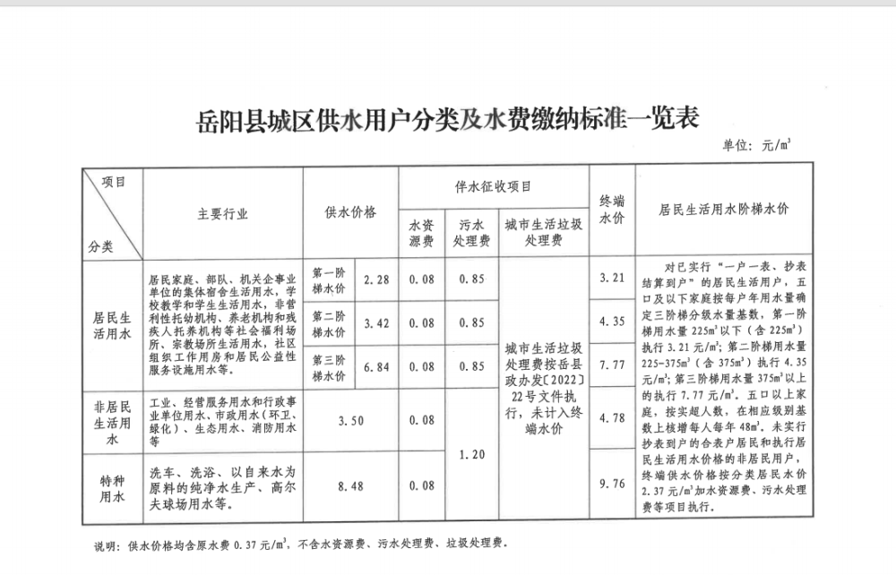 嶽陽縣城區供水用戶分類及水費繳納標準一覽表