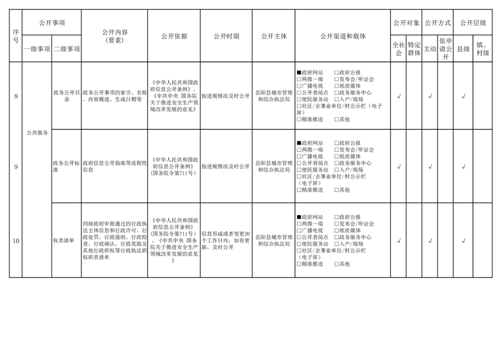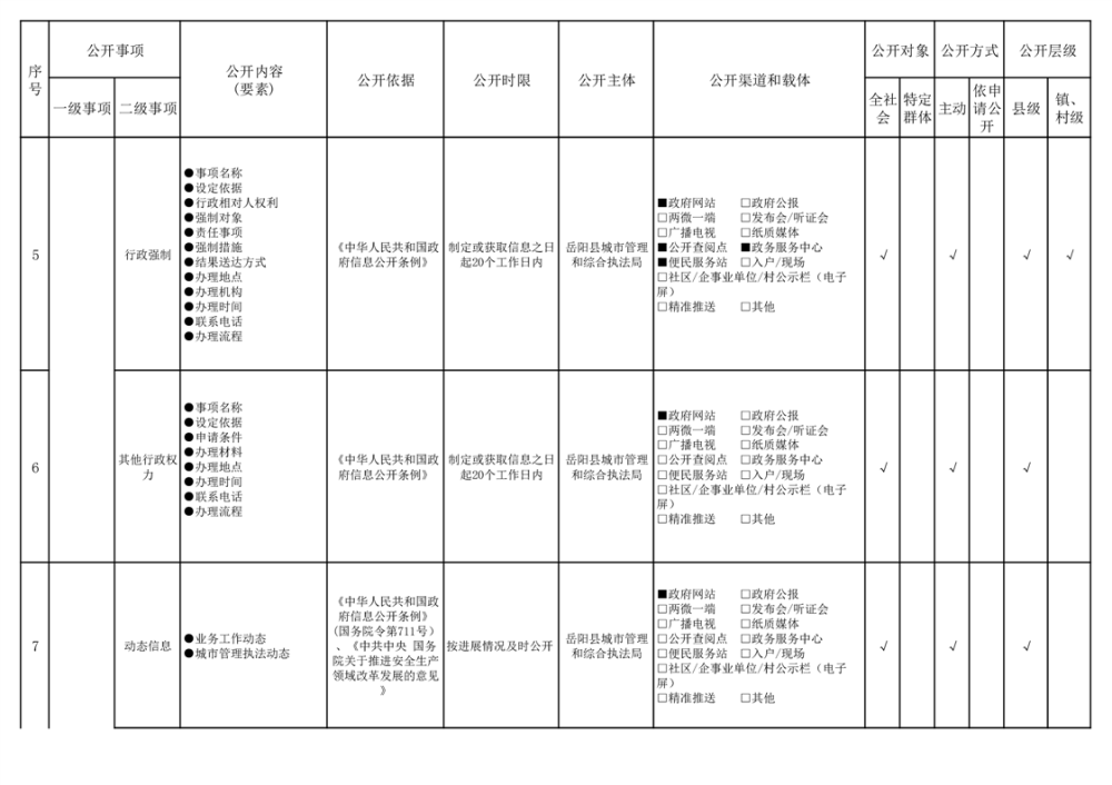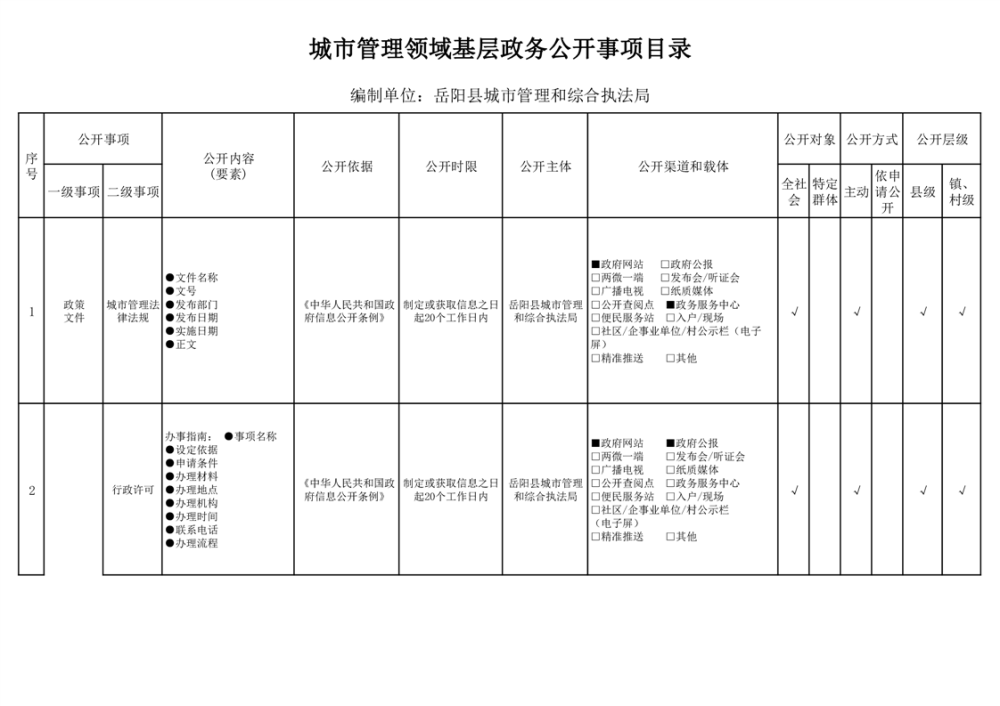 2024年嶽陽縣城市綜合執法領域基層政務公開標準目錄