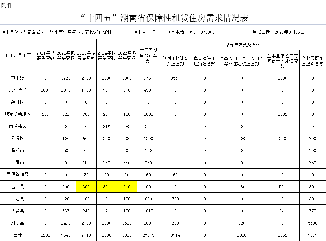 “十四五”湖南省保障性租賃住房需求情況表
