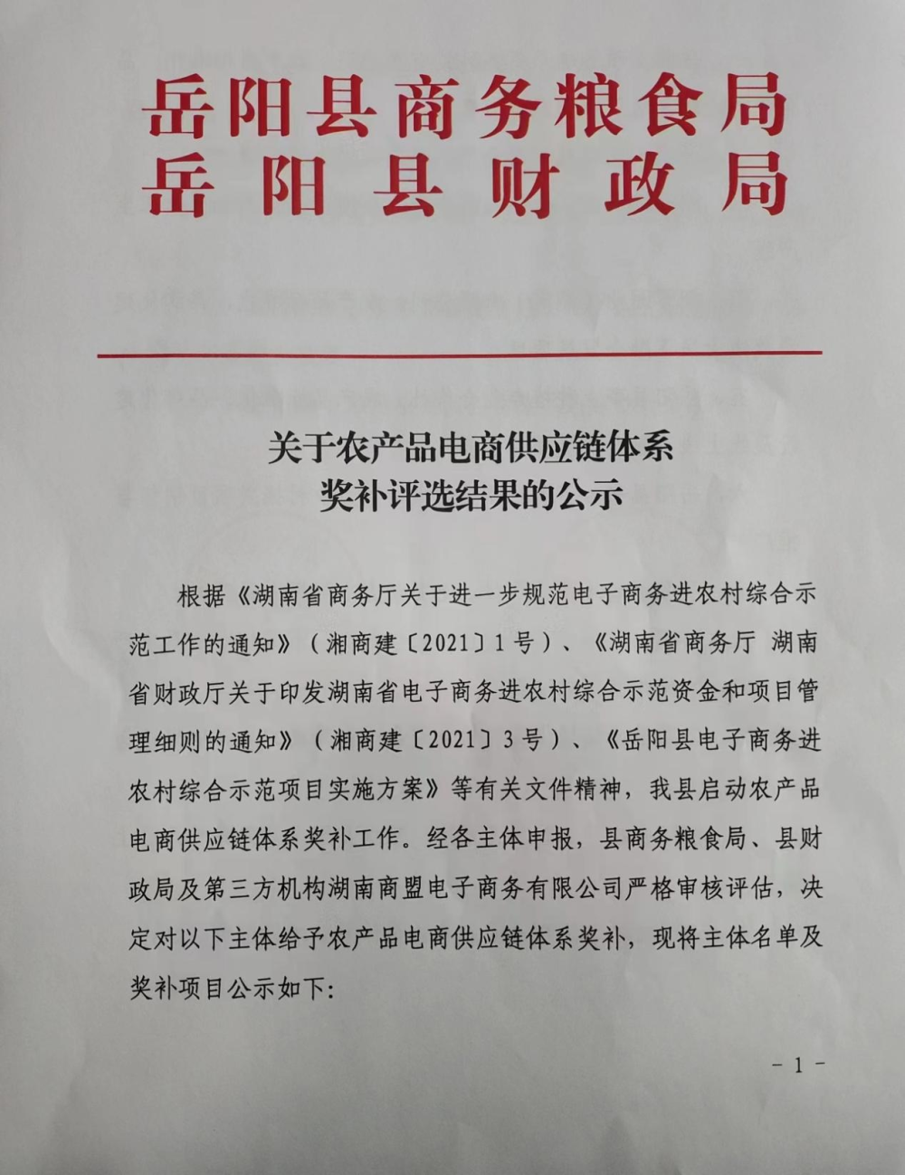 關於農產品電商供應鏈體係獎補評選結果的公示