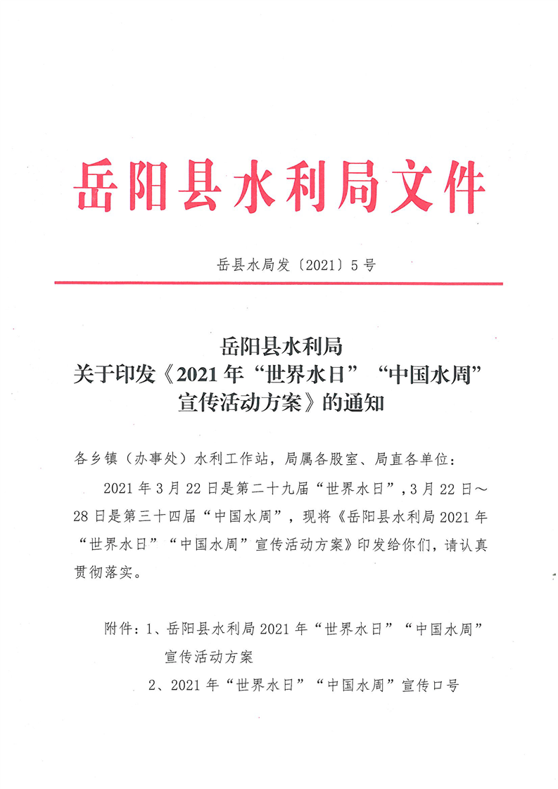 嶽陽縣水利局關於印發《2021年“世界水日”“中國水周”宣傳活動方案》的通知