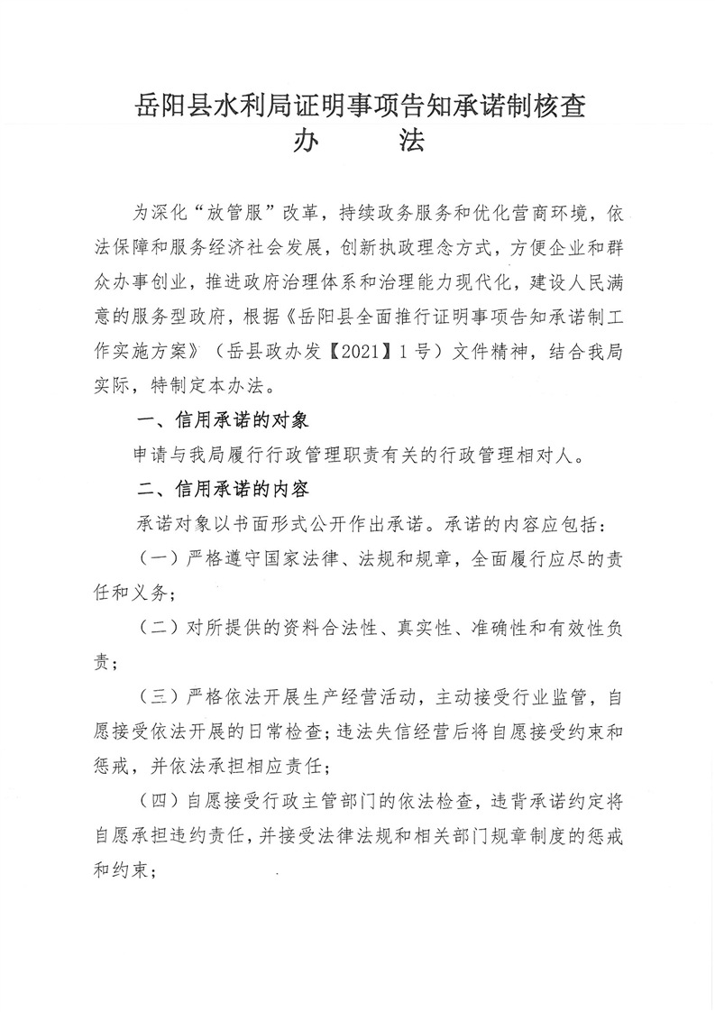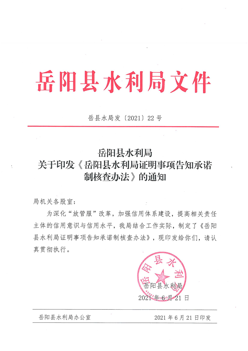 嶽陽縣水利局關於印發《嶽陽縣水利局證明事項告知承諾製核查辦法》的通知