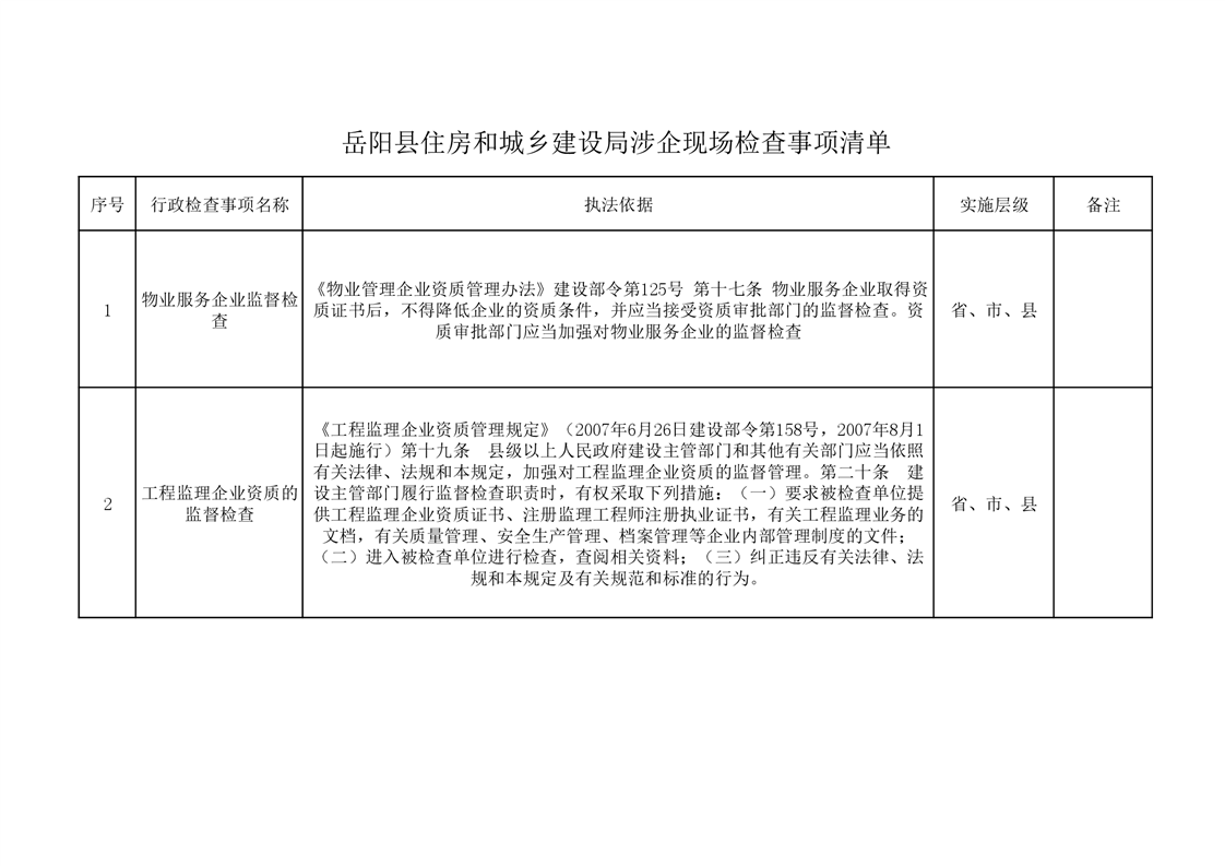 嶽陽縣住房和城鄉建設局涉企現場檢查事項清單