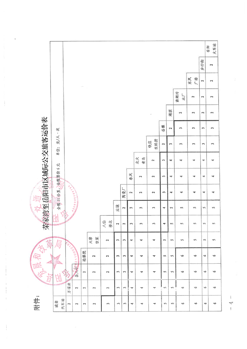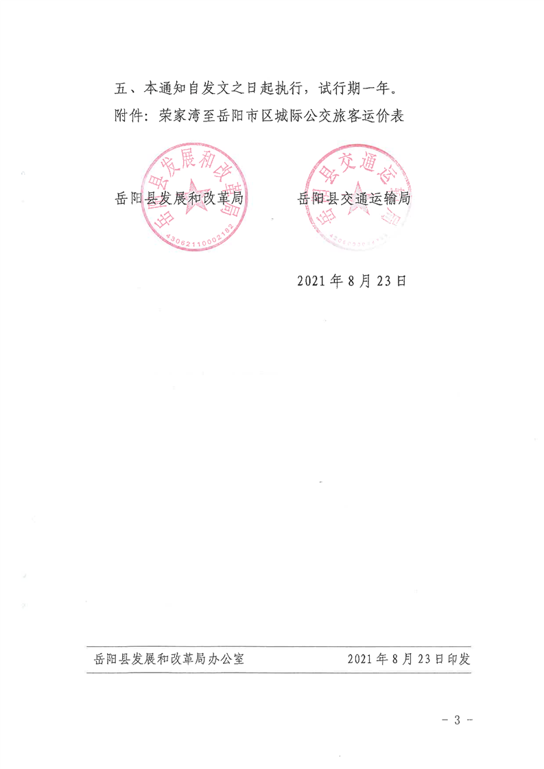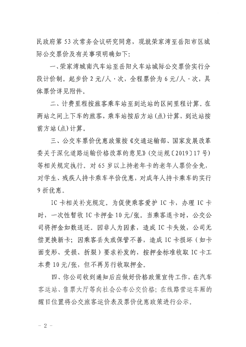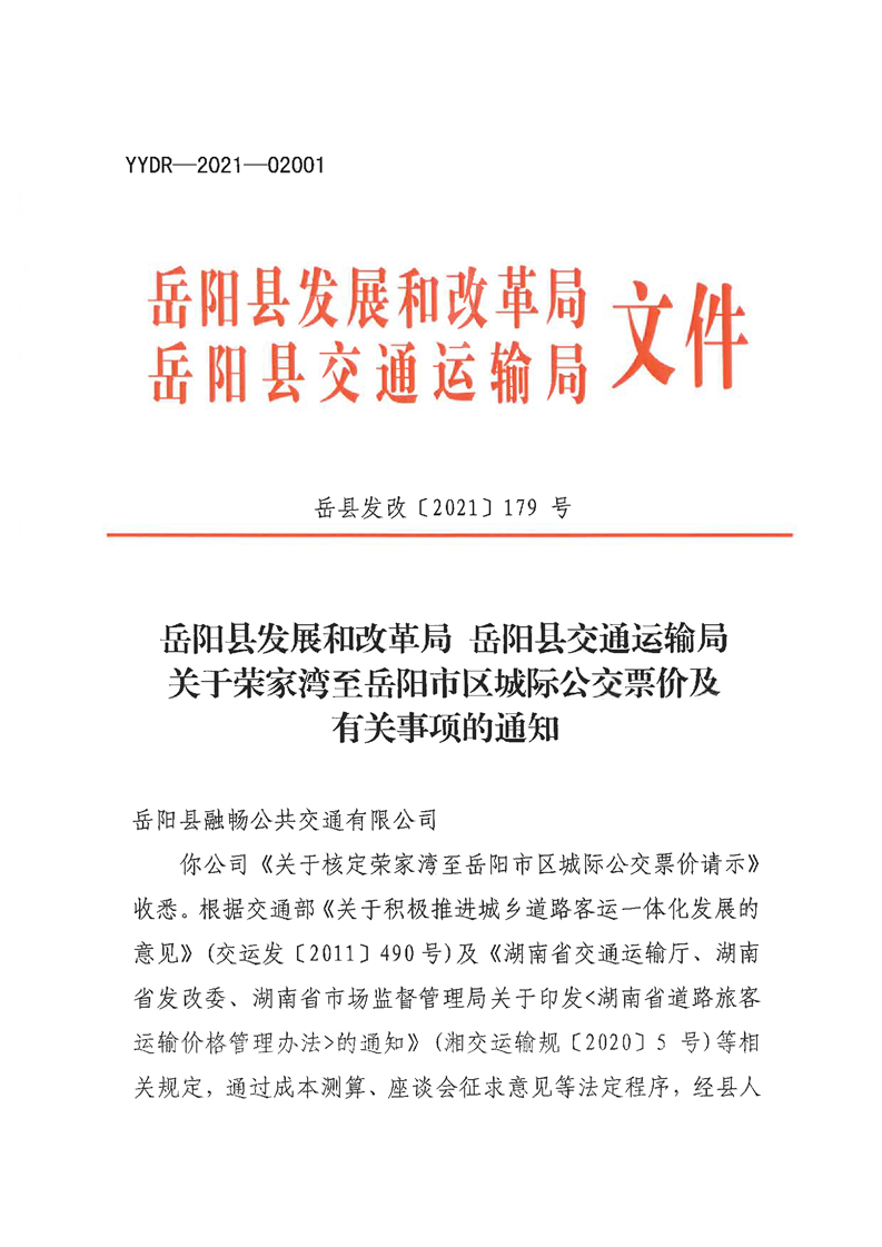 嶽陽縣發展和改革局 嶽陽縣交通運輸局《關於榮家灣至嶽陽市區城際公交票價及有關事項的通知》