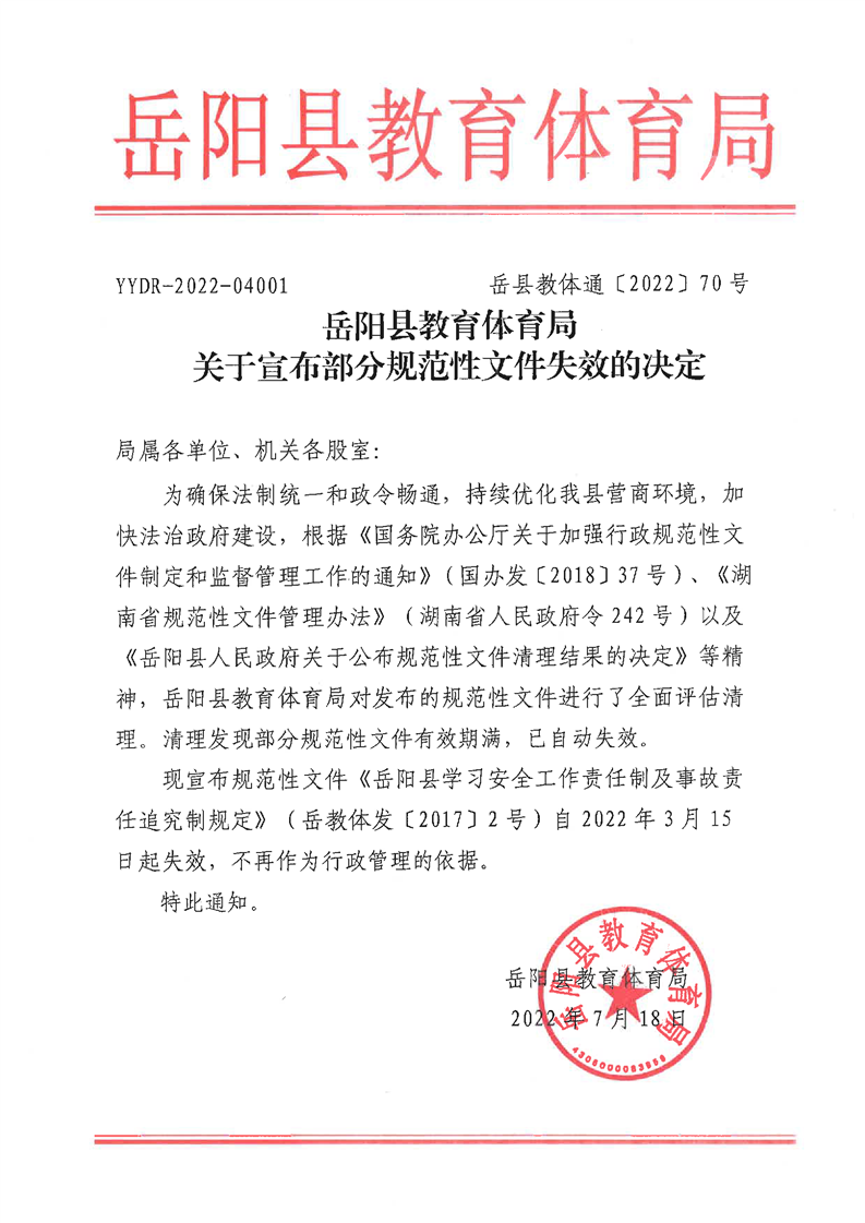 嶽陽縣教育體育局關於宣布部分規範性文件失效的決定