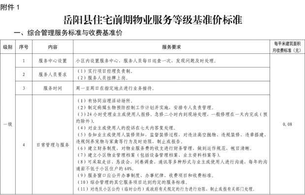 附件:1.嶽陽縣住宅前期物業服務等級基準價標準