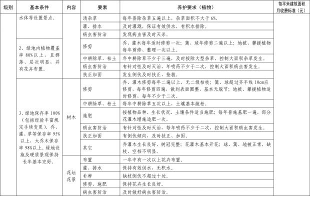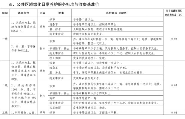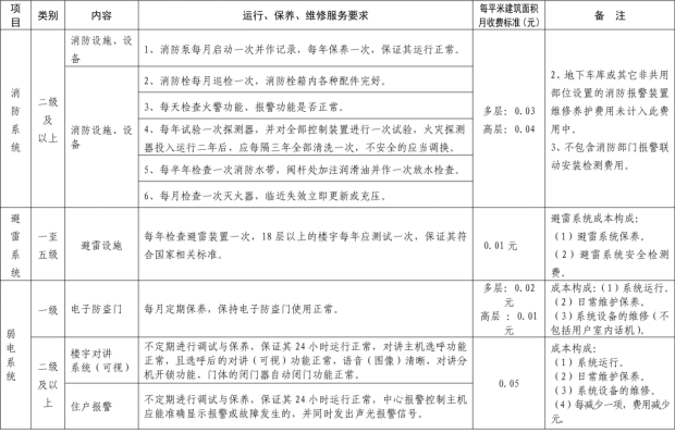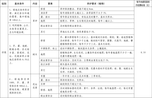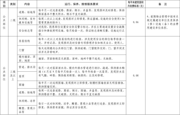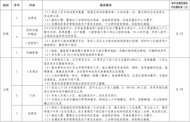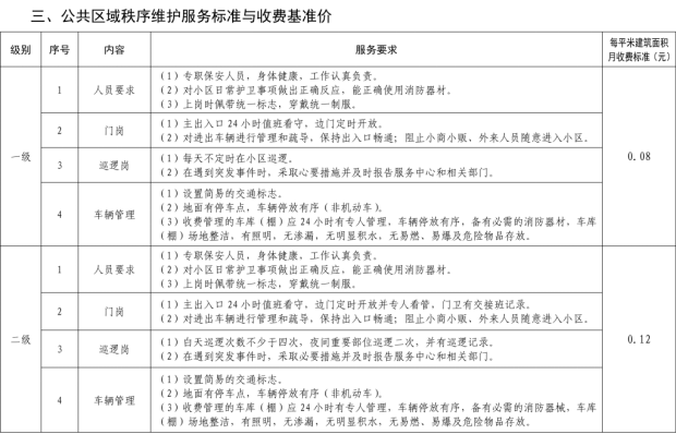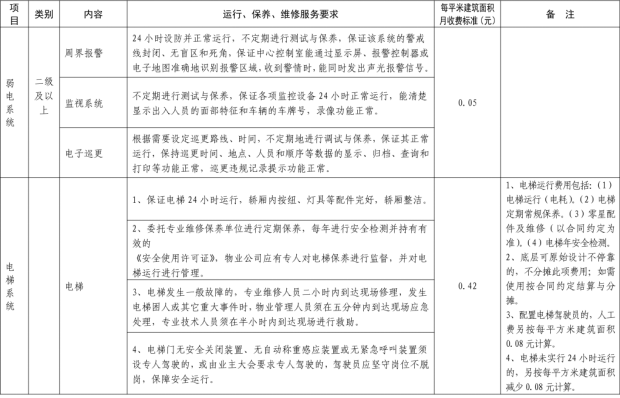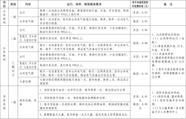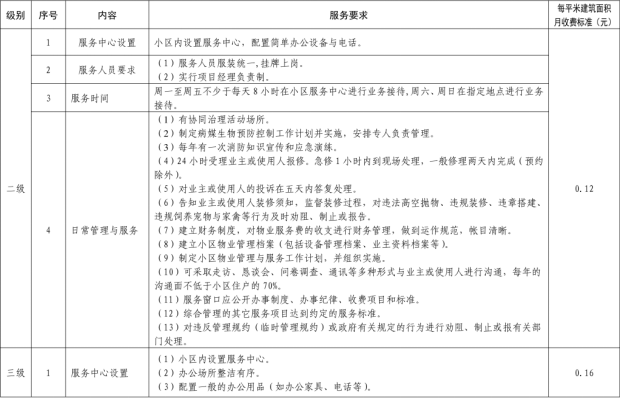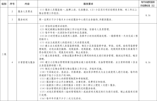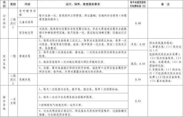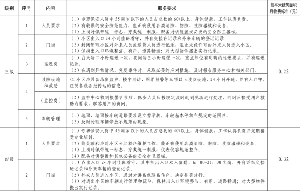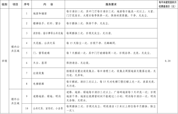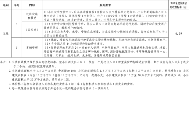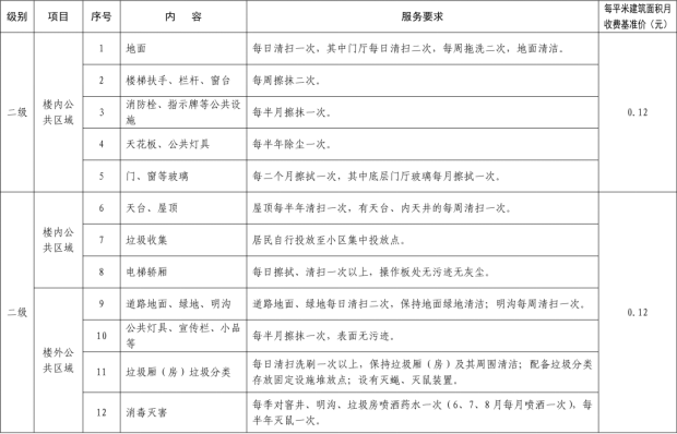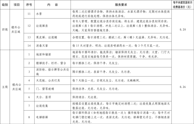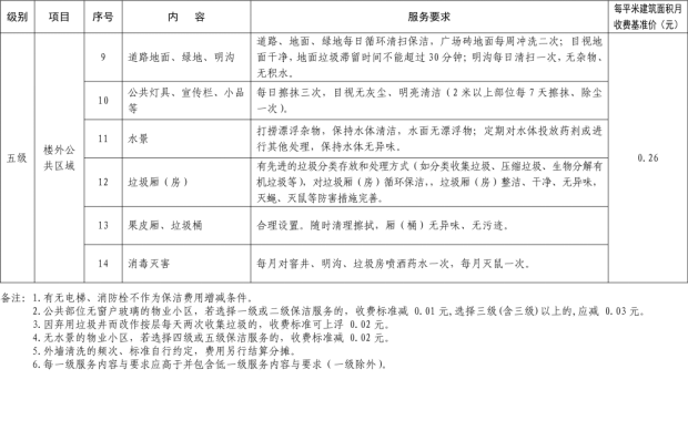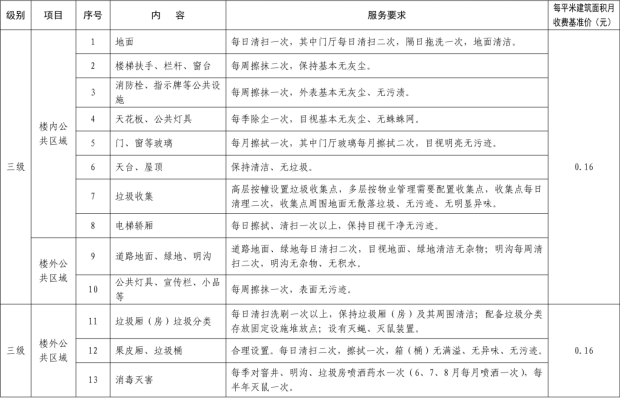 二、我縣範圍普通住宅物業服務等級分為一、二、三、四、五級,最低等級為一級,最高等級為五級。住宅公共性物業服務項目包括:綜合管理服務,公共區域清潔衛生服務,公共區域秩序維護服務,公共區域綠化養護服務,以及共用部位、共用設施設備的日常運行、保養及維護服務等五項。實行指導價的公共性物業服務收費可以基準價為基礎上下浮動15%。(具體細則詳見附件1)。