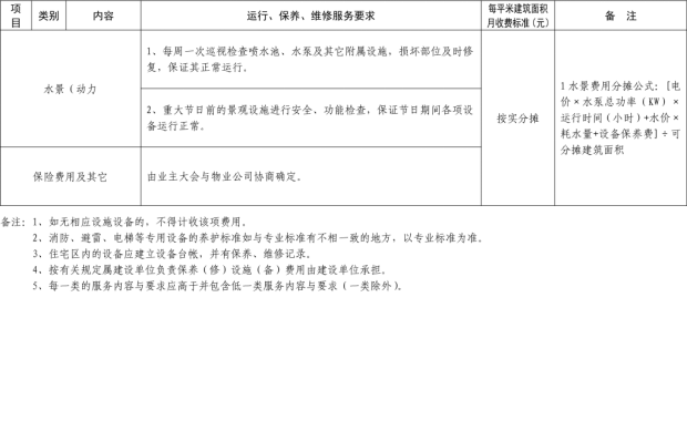 一、我縣範圍內保障性住房、業主大會成立之前的普通商品住宅物業服務費收取標準(包括已購車位物業服務費、裝修服務費和裝修垃圾清運費)實行政府指導價。普通商品住宅前期物業服務費指的是業主大會成立之前的普通商品住宅物業服務費。前期物業服務費具體收費標準由縣發展和改革部門會同縣住房和城鄉建設部門根據物業服務質量等級標準、服務內容等因素製定基準價及浮動幅度向社會公布(詳見附件1、2)。