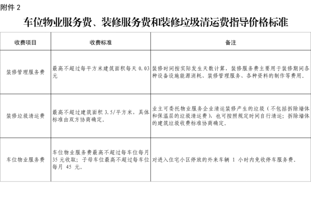 2.車位物業服務費、裝修服務費和裝修垃圾清運費指導價格標準