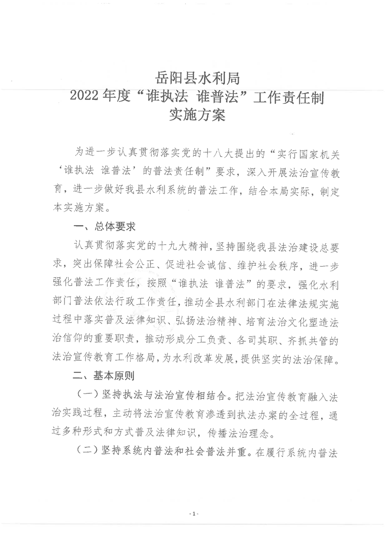 關於印發《嶽陽縣水利局2022年度“誰執法 誰普法”工作責任製實施方案》的通知