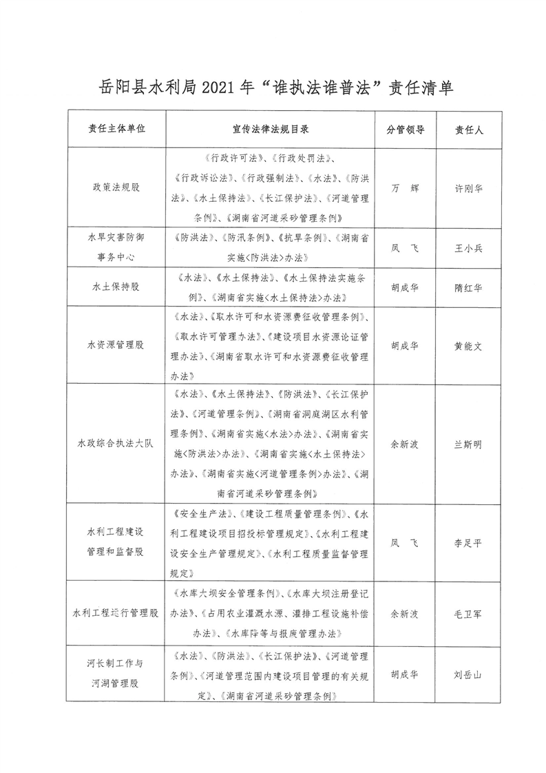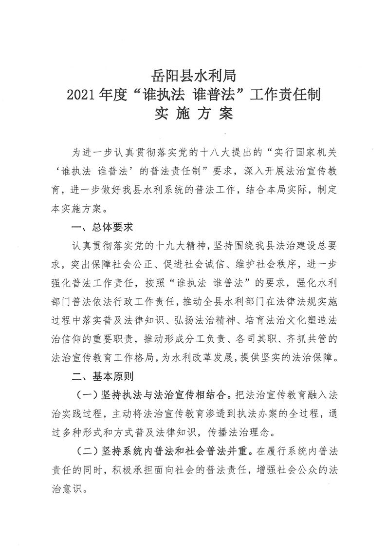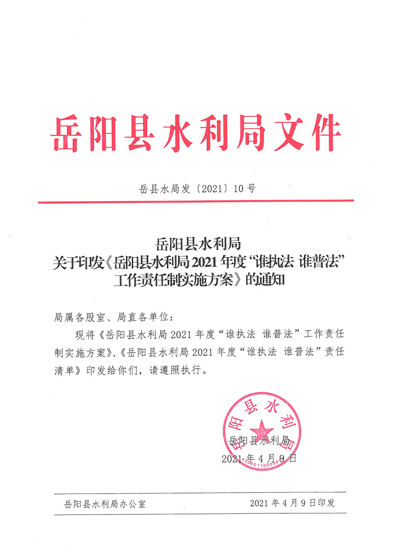 關於印發《嶽陽縣水利局2021年度“誰執法 誰普法”工作責任製實施方案》的通知