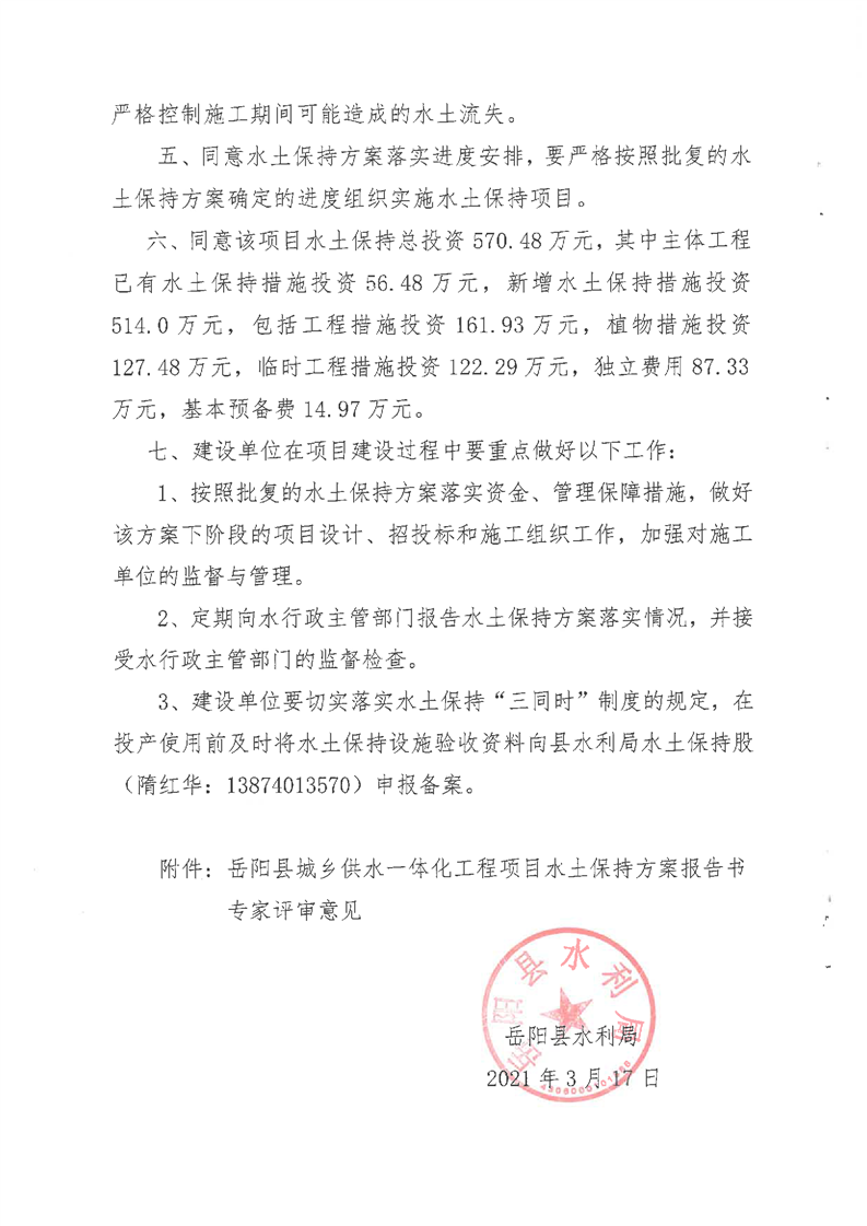 嶽陽縣水利局關於同意《嶽陽縣城鄉供水一體化工程項目水土保持方案報告書》的批複