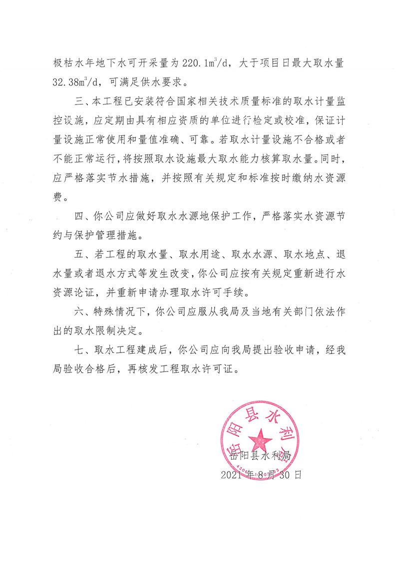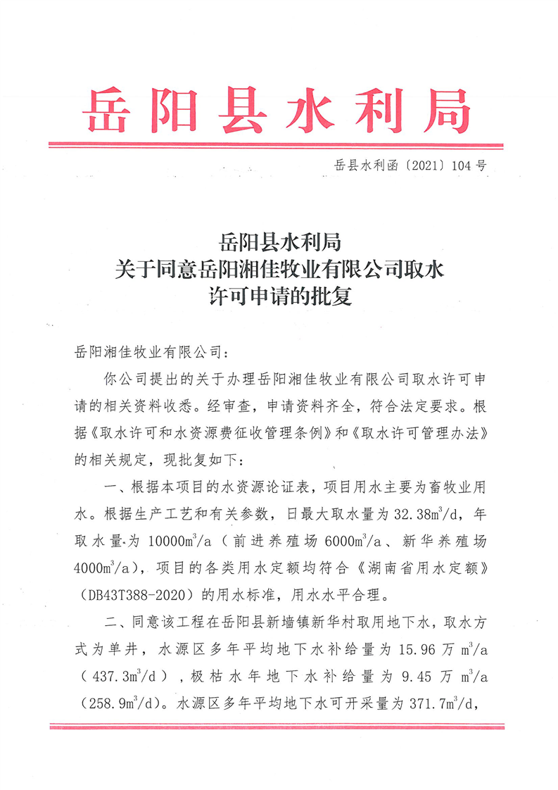 嶽陽縣水利局關於同意嶽陽湘佳牧業有限公司取水許可申請的批複