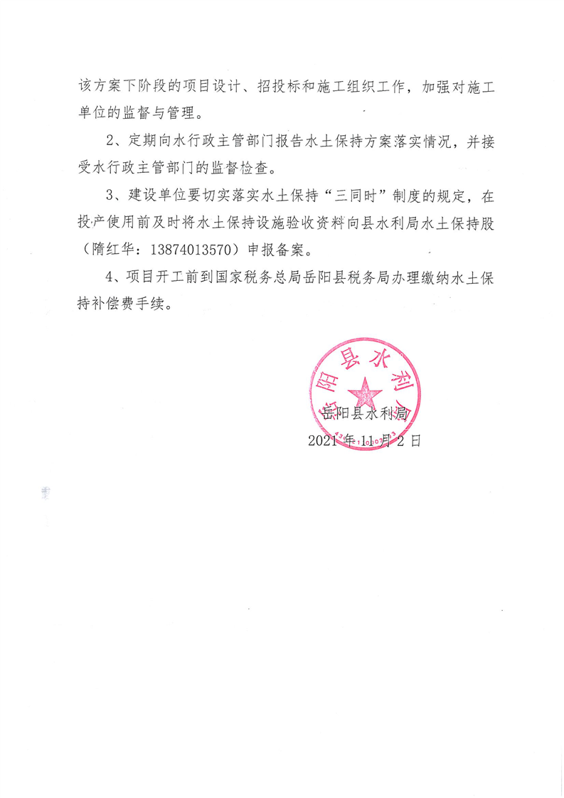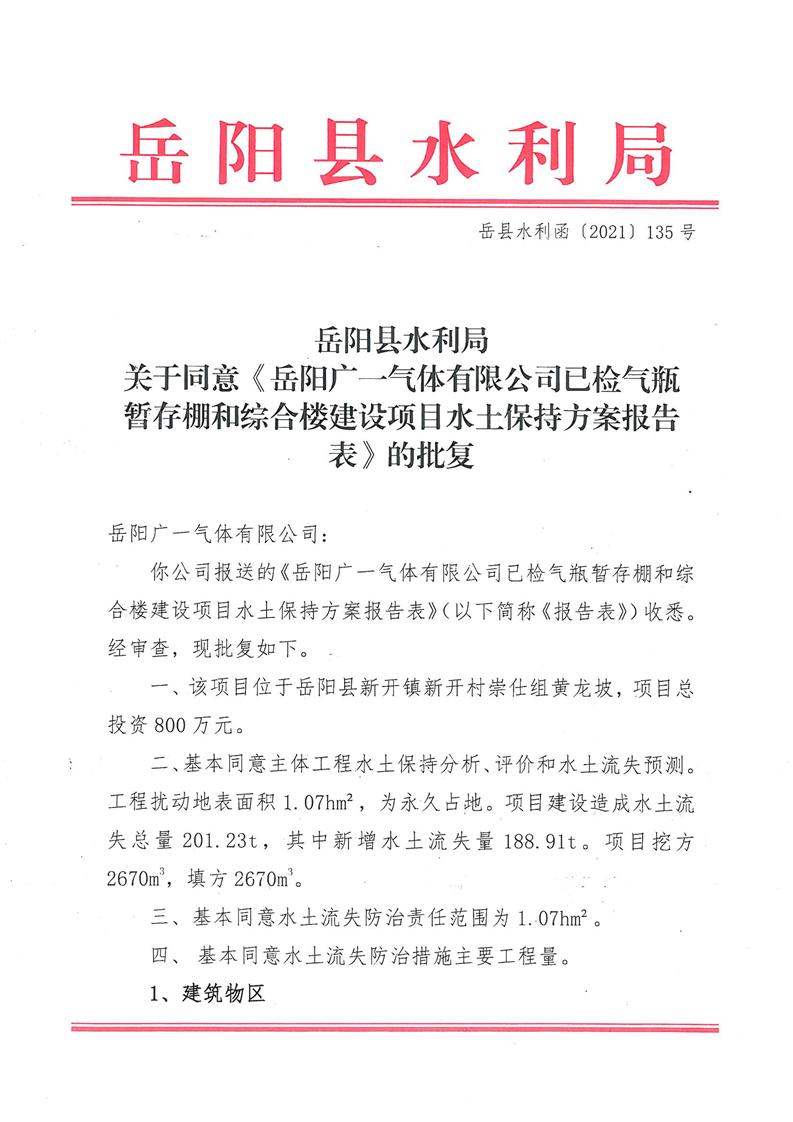 嶽陽縣水利局關於同意《嶽陽廣一氣體有限公司已檢氣瓶暫存棚和綜合樓建設項目水土保持方案報告表》的批複