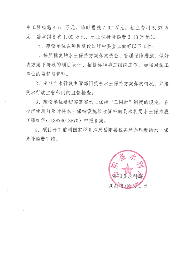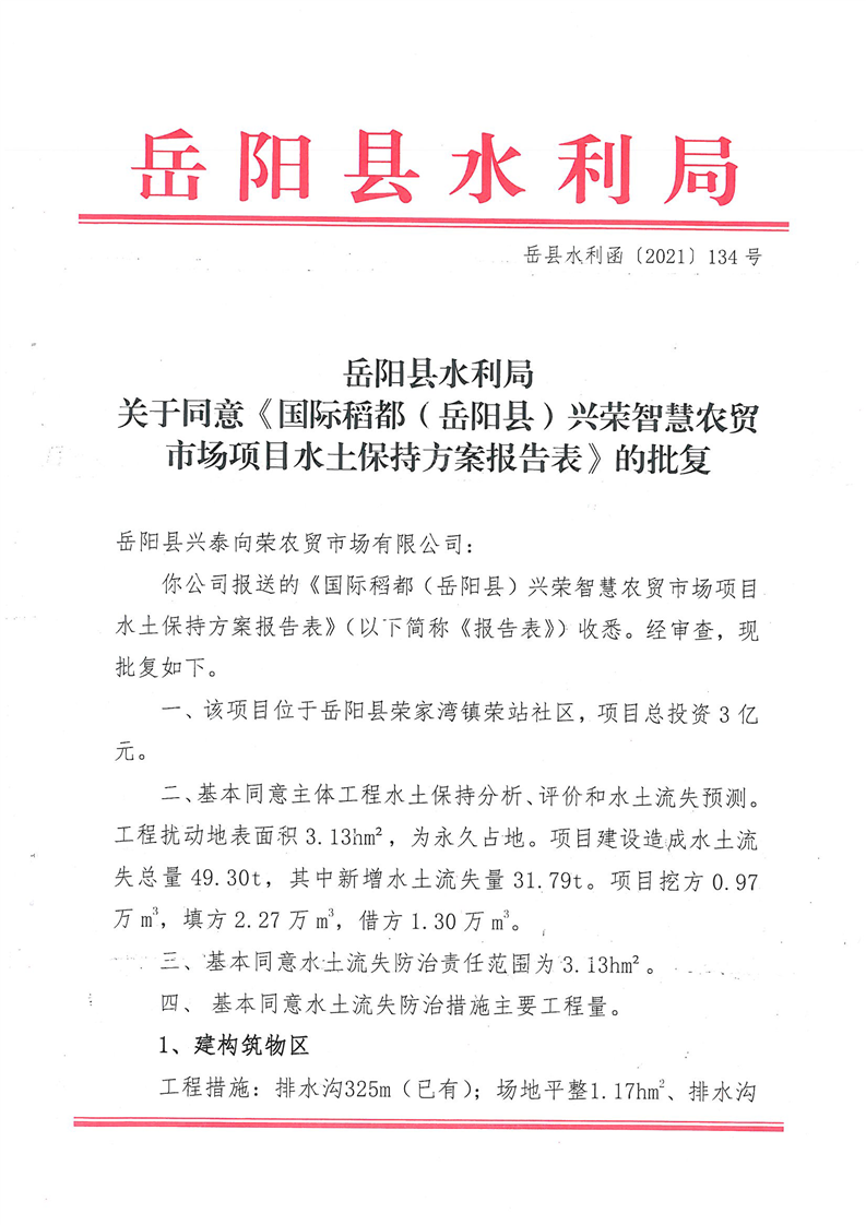 嶽陽縣水利局關於同意《國際稻都(嶽陽縣)興榮智慧農貿市場項目水土保持方案報告表》的批複