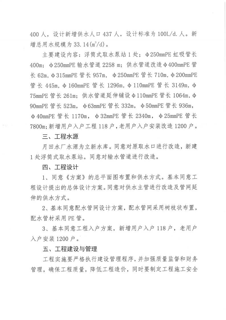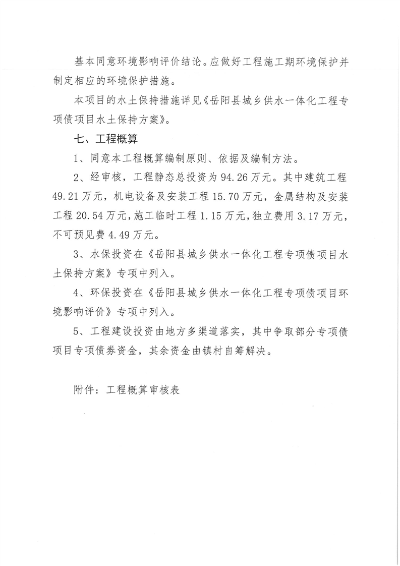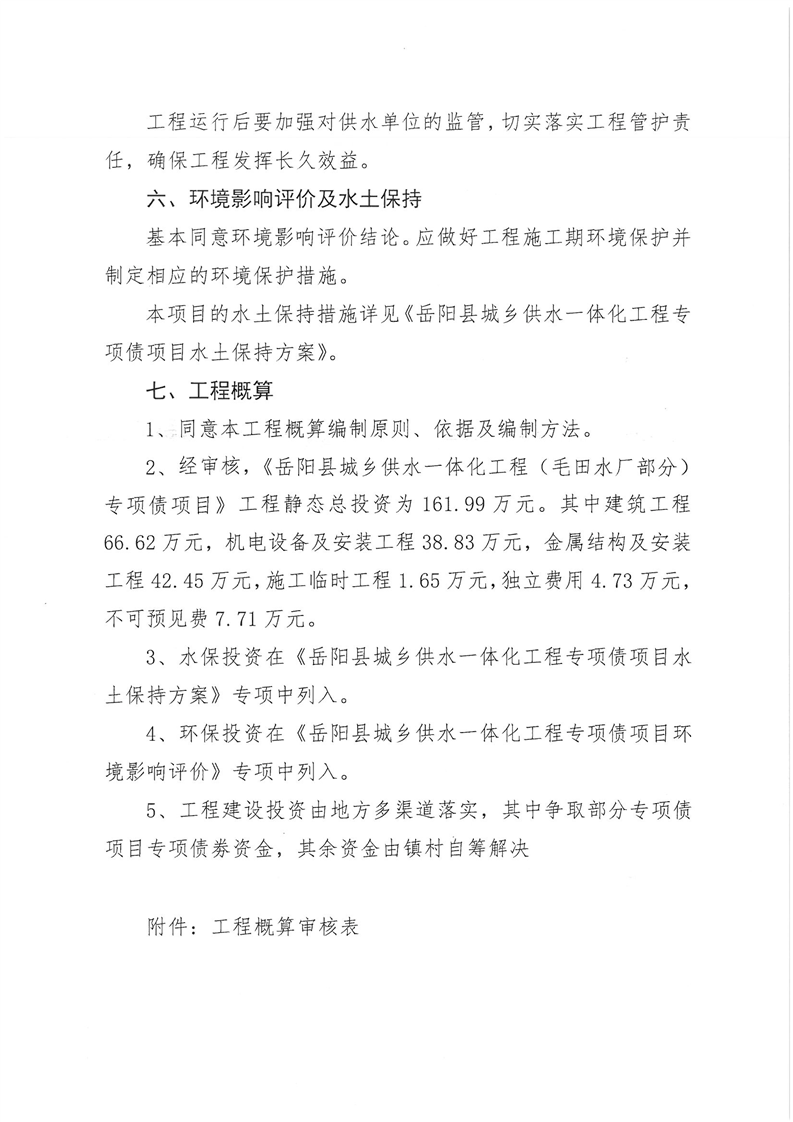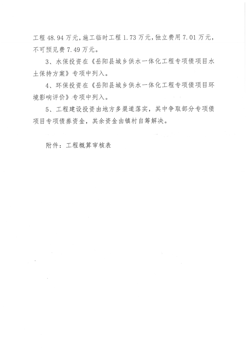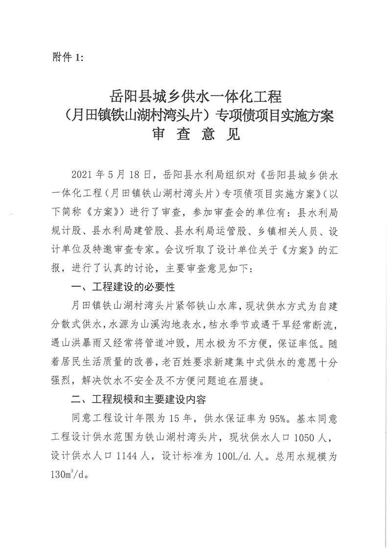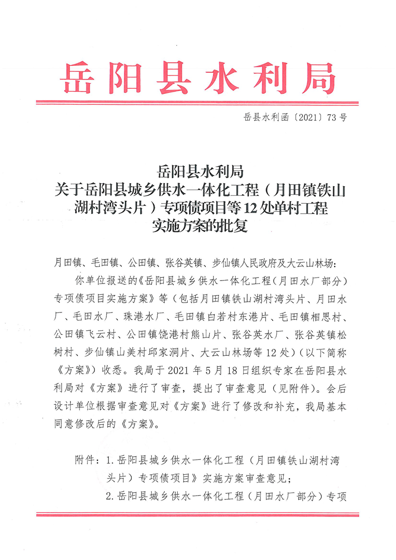 嶽陽縣水利局關於嶽陽縣城鄉供水一體化工程(月田鎮鐵山湖村灣頭片)專項債項目等12處單村工程實施方案的批複