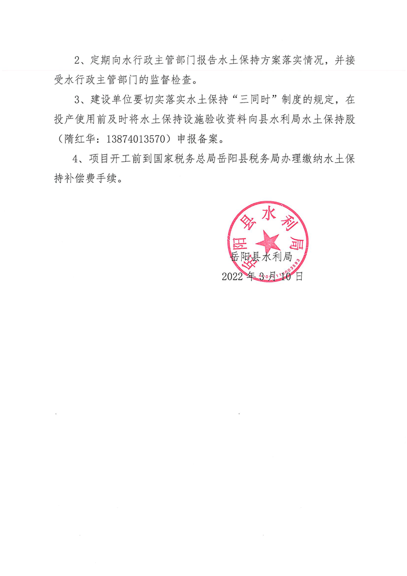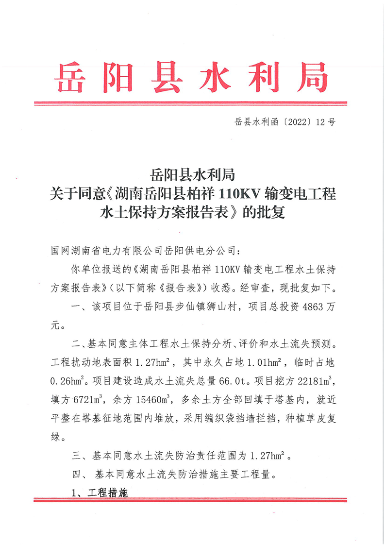 嶽陽縣水利局關於同意《湖南嶽陽縣柏祥110KV輸變電工程水土保持方案報告表》的批複