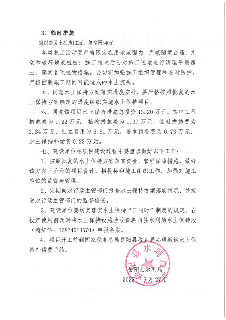 嶽陽縣水利局關於同意《湖南嶽陽縣柏祥110KV變電站35KV送出工程水土保持方案報告表》的批複