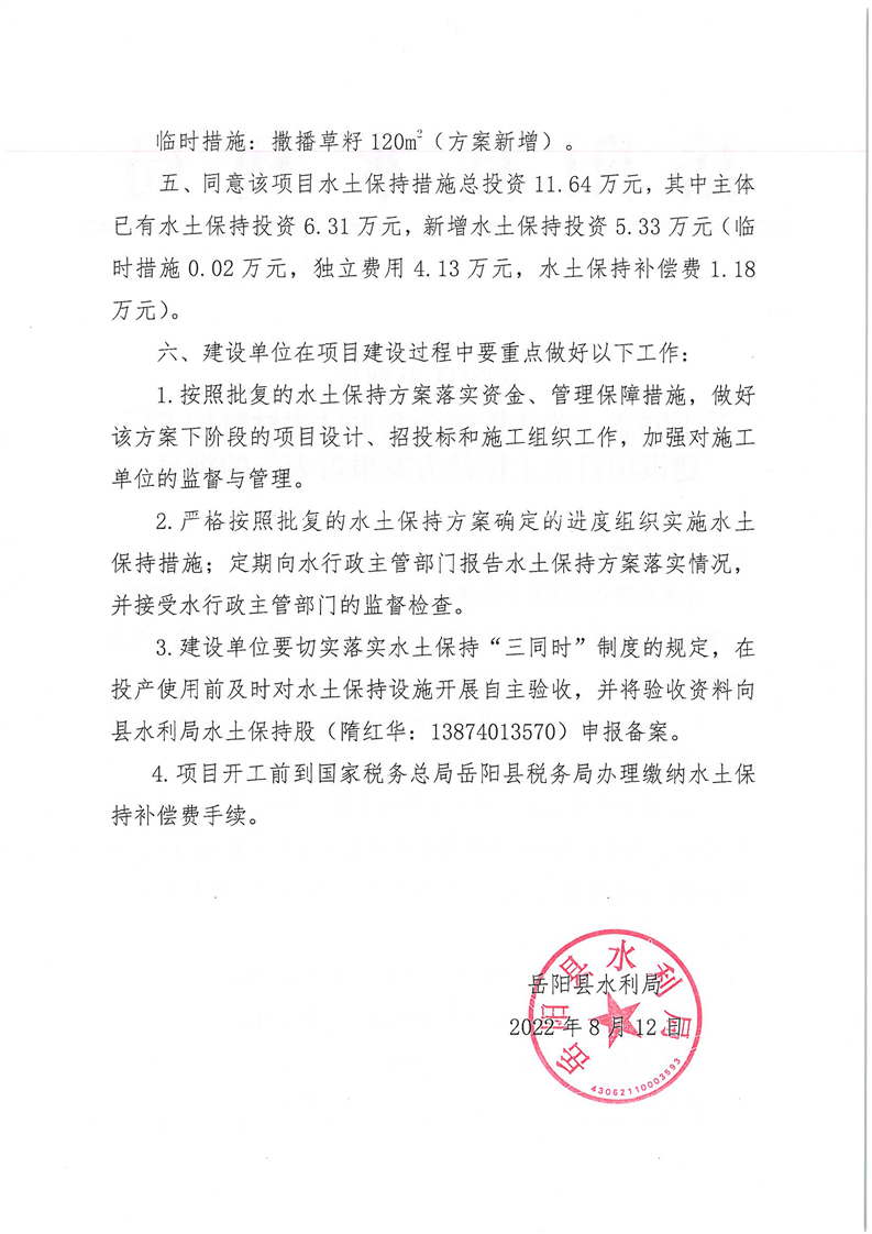 嶽陽縣水利局關於同意《黃沙街鎮金磊水過濾材料加工廠建設項目水土保持方案報告表》的批複