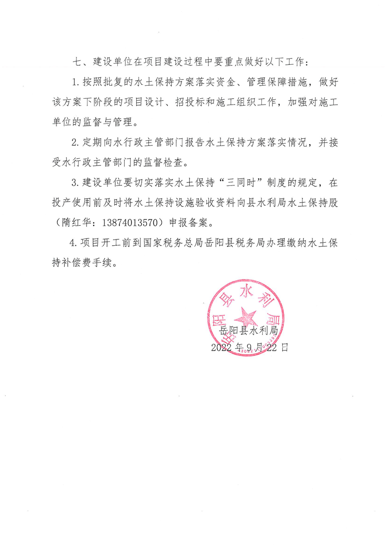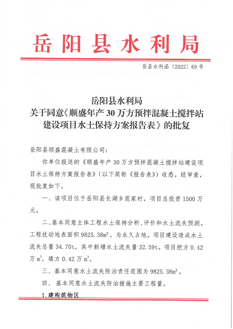嶽陽縣水利局關於同意《順盛年產30萬方預拌混凝土攪拌站建設項目水土保持方案報告表》的批複