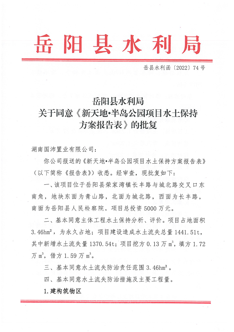 嶽陽縣水利局關於同意《新天地•半島公園項目水土保持方案報告表》的批複