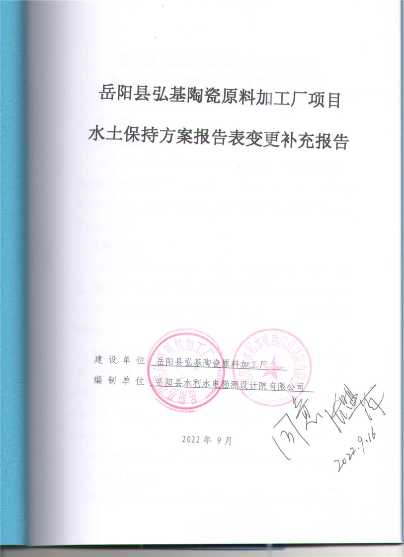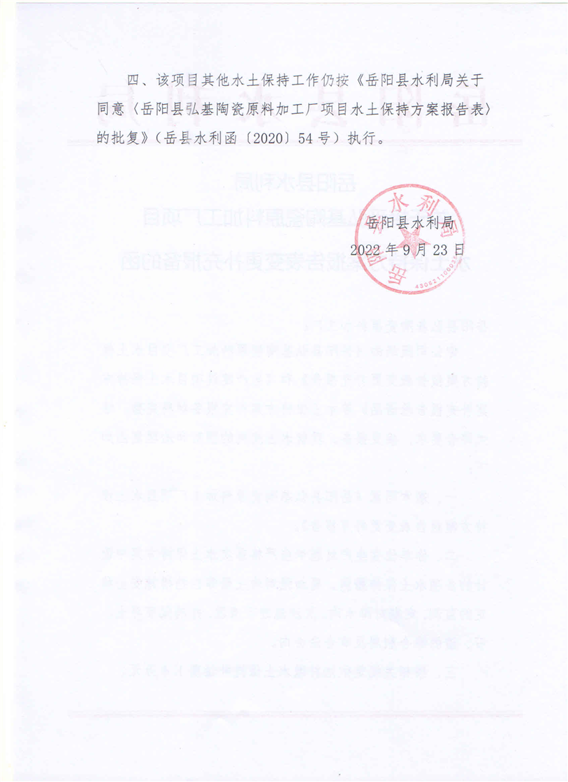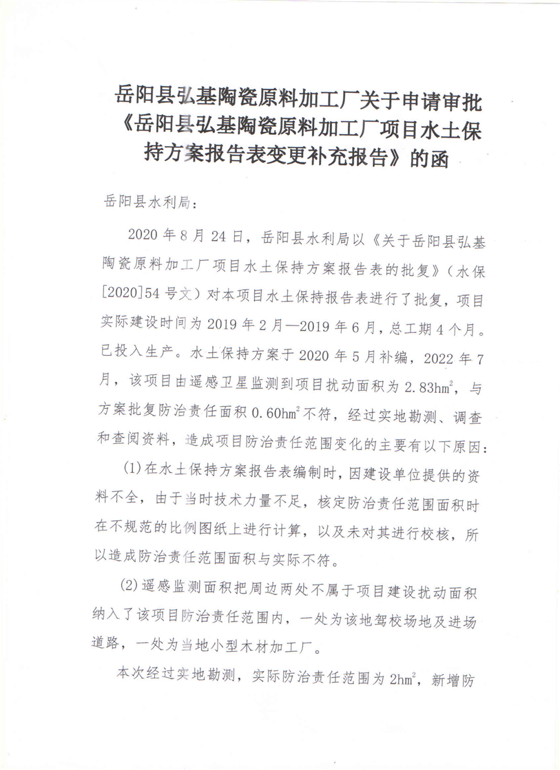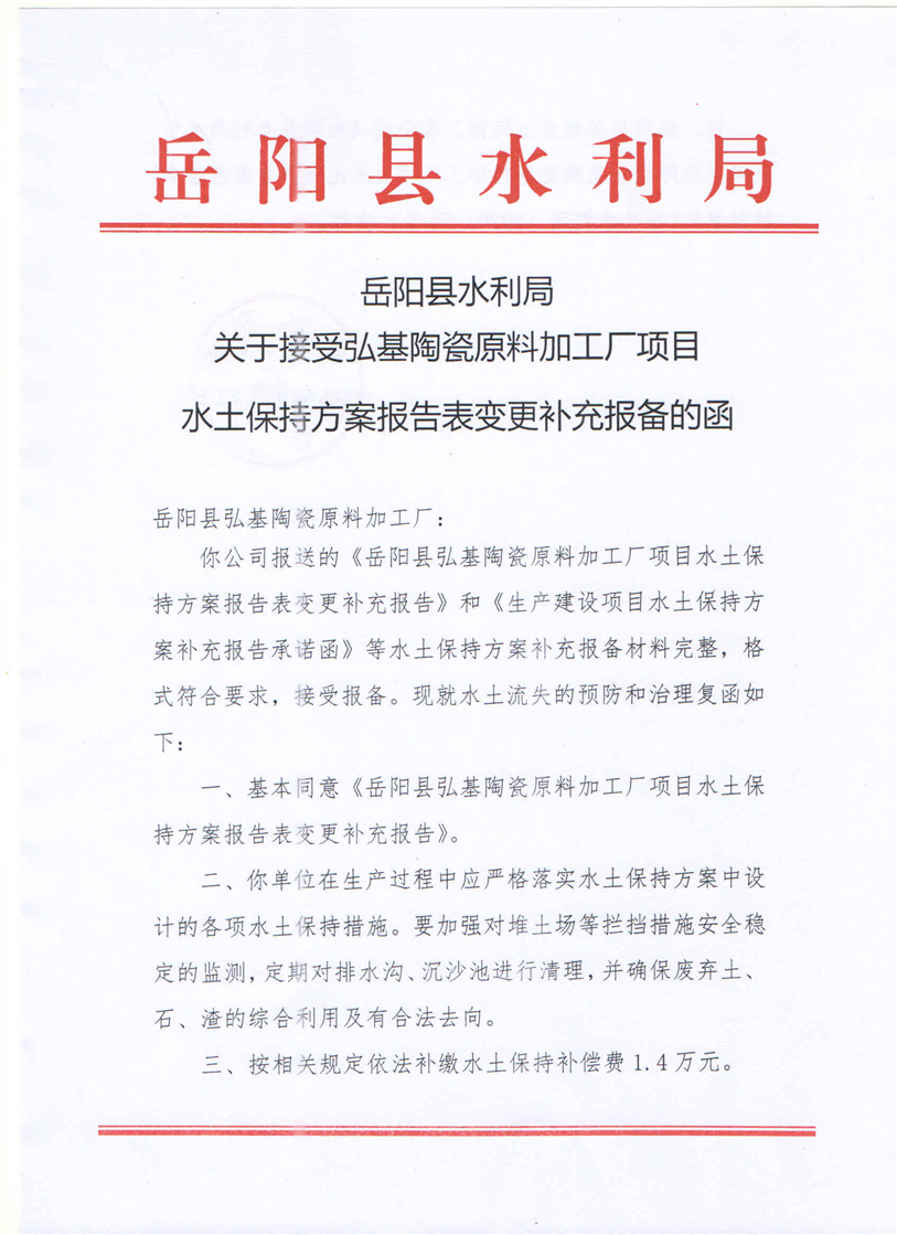 嶽陽縣水利局關於接受弘基陶瓷原料加工廠項目水土保持方案報告表變更補充報備的函
