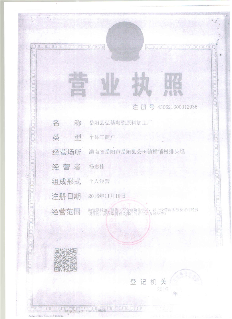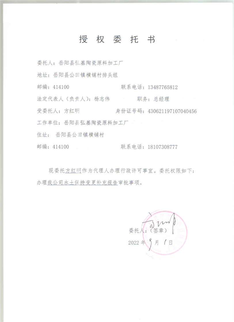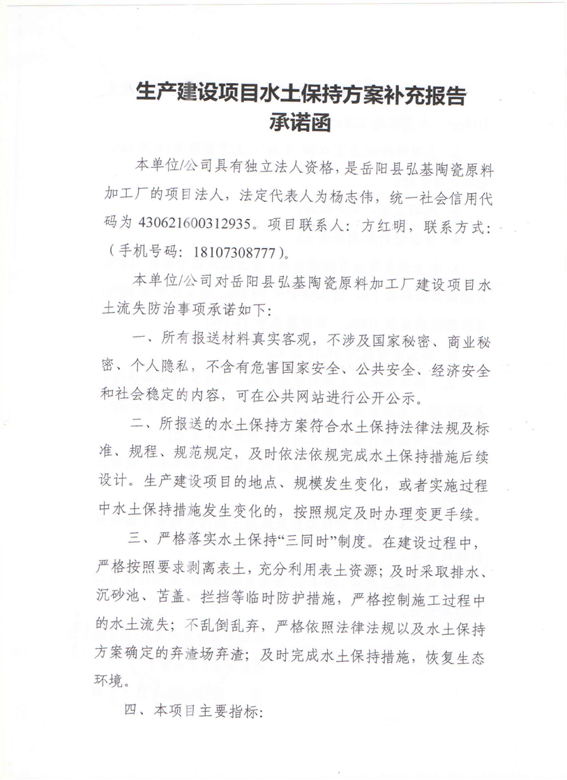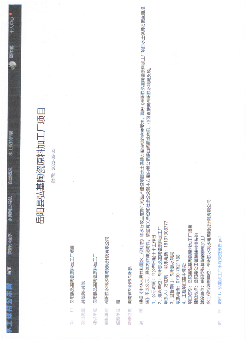 嶽陽縣水利局關於接受弘基陶瓷原料加工廠項目水土保持方案報告表變更補充報備的函