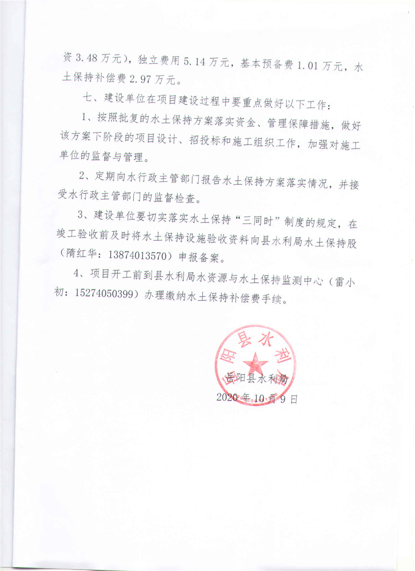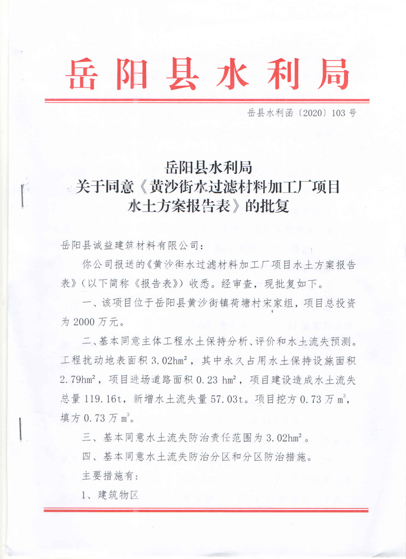 嶽陽縣水利局關於同意《黃沙街水過濾材料加工廠項目水土保持方案報告表》的批複
