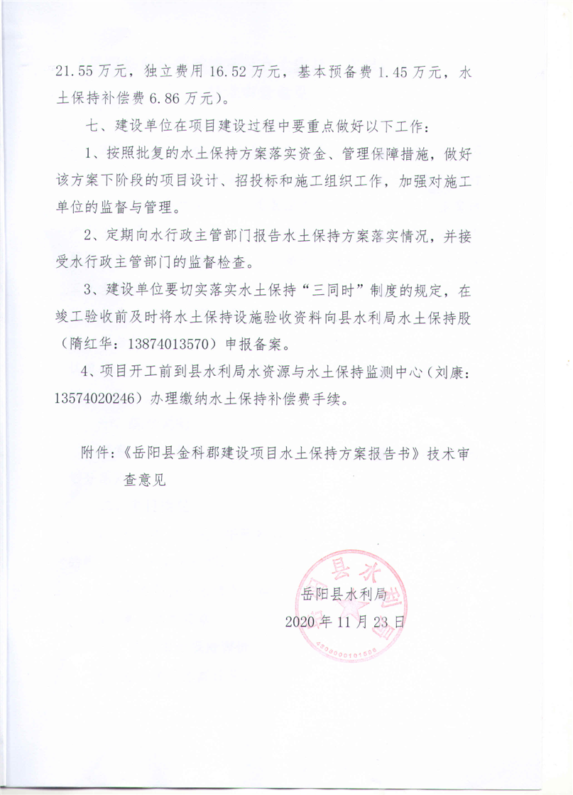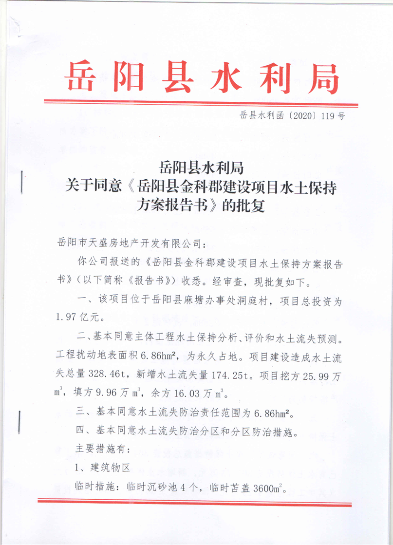 嶽陽縣水利局關於同意《嶽陽縣金科郡建設項目水土保持方案報告書》的批複