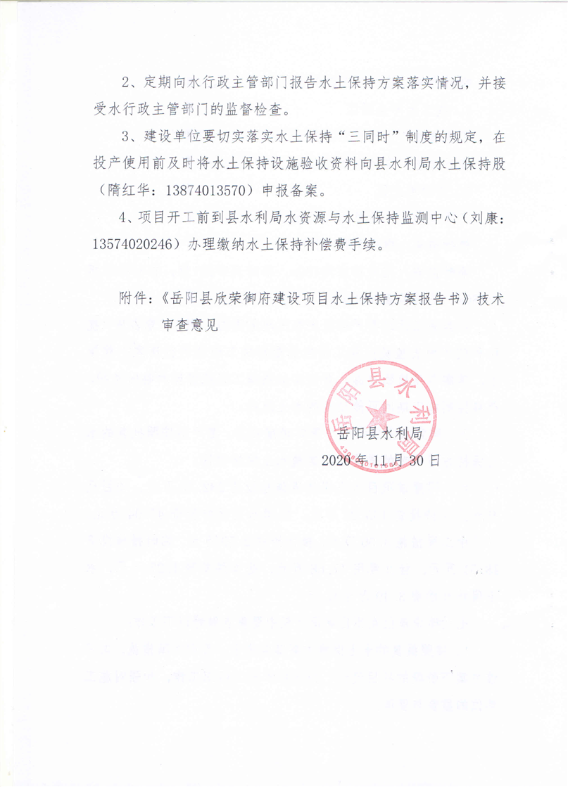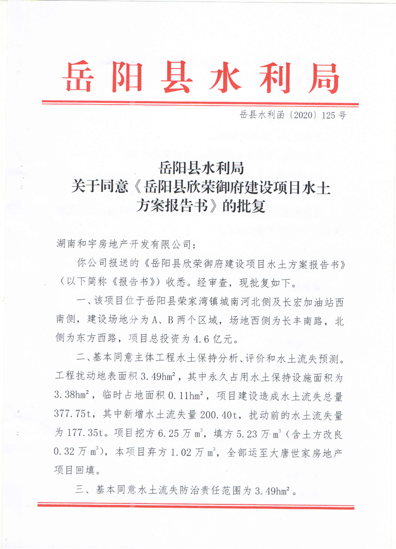 嶽陽縣水利局關於同意《嶽陽縣欣榮禦府建設項目水土保持方案報告書》的批複
