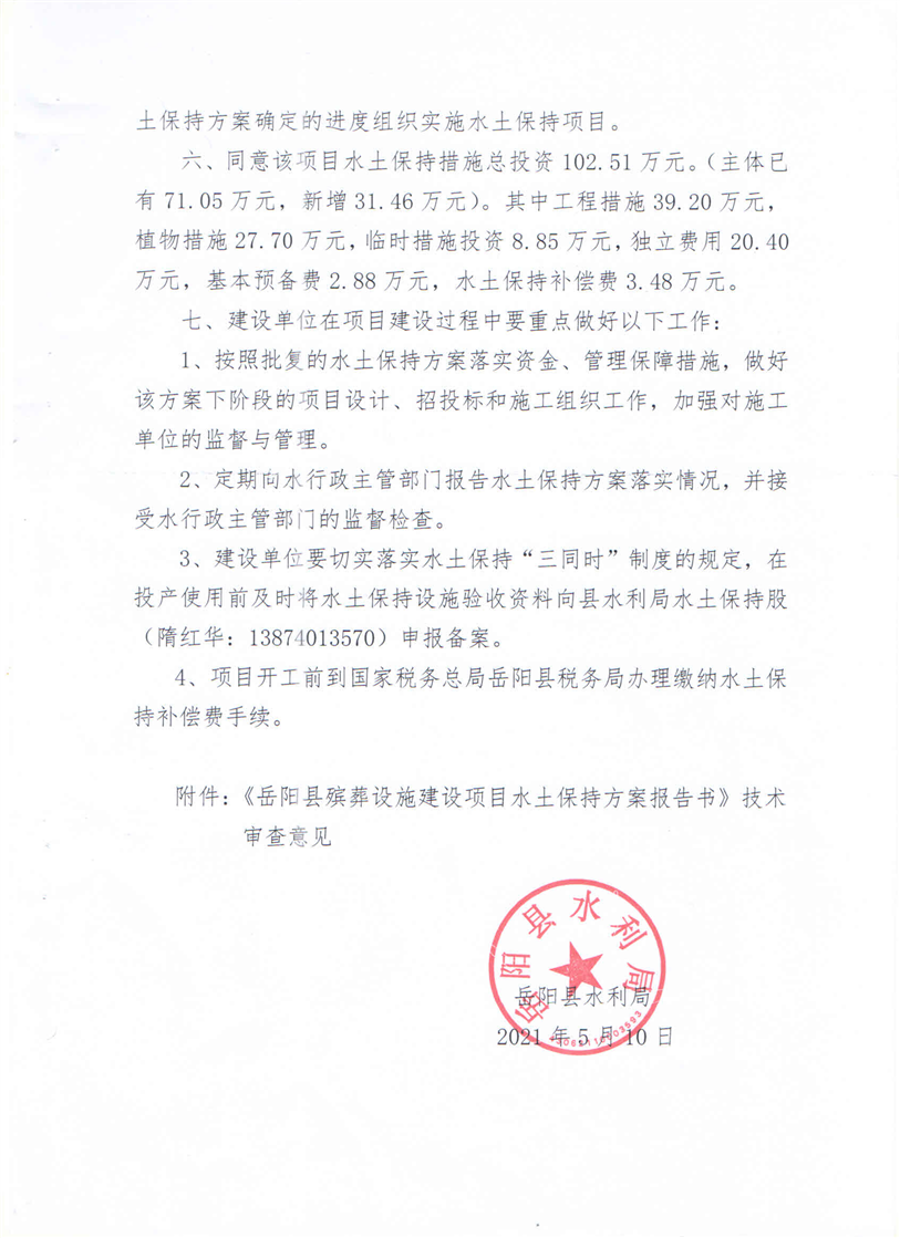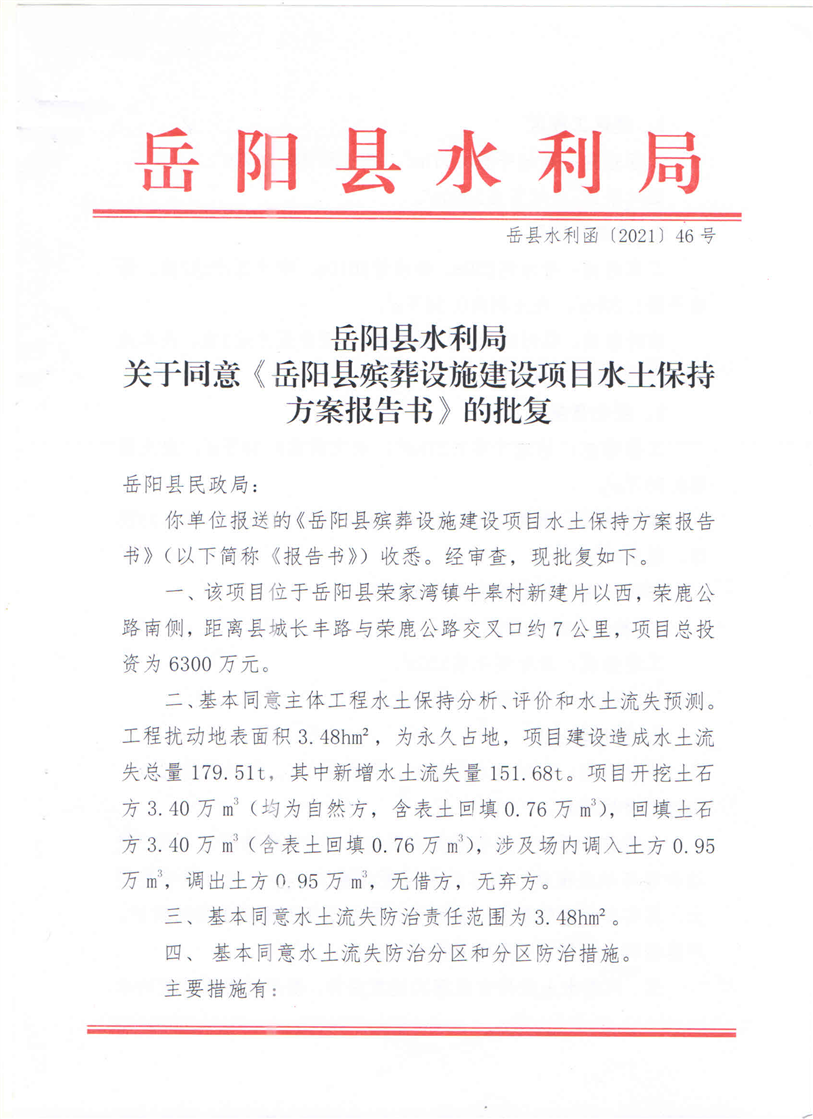 嶽陽縣水利局關於同意《嶽陽縣殯葬設施建設項目水土保持方案報告書》的批複