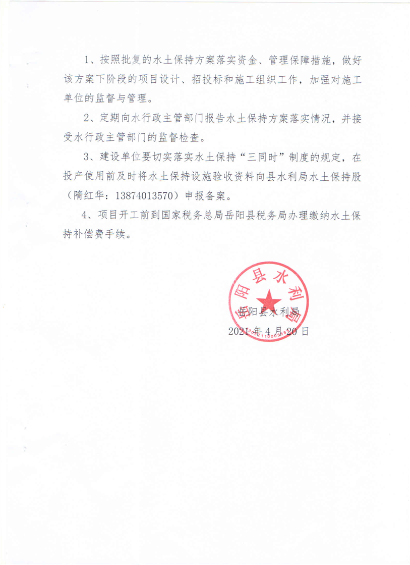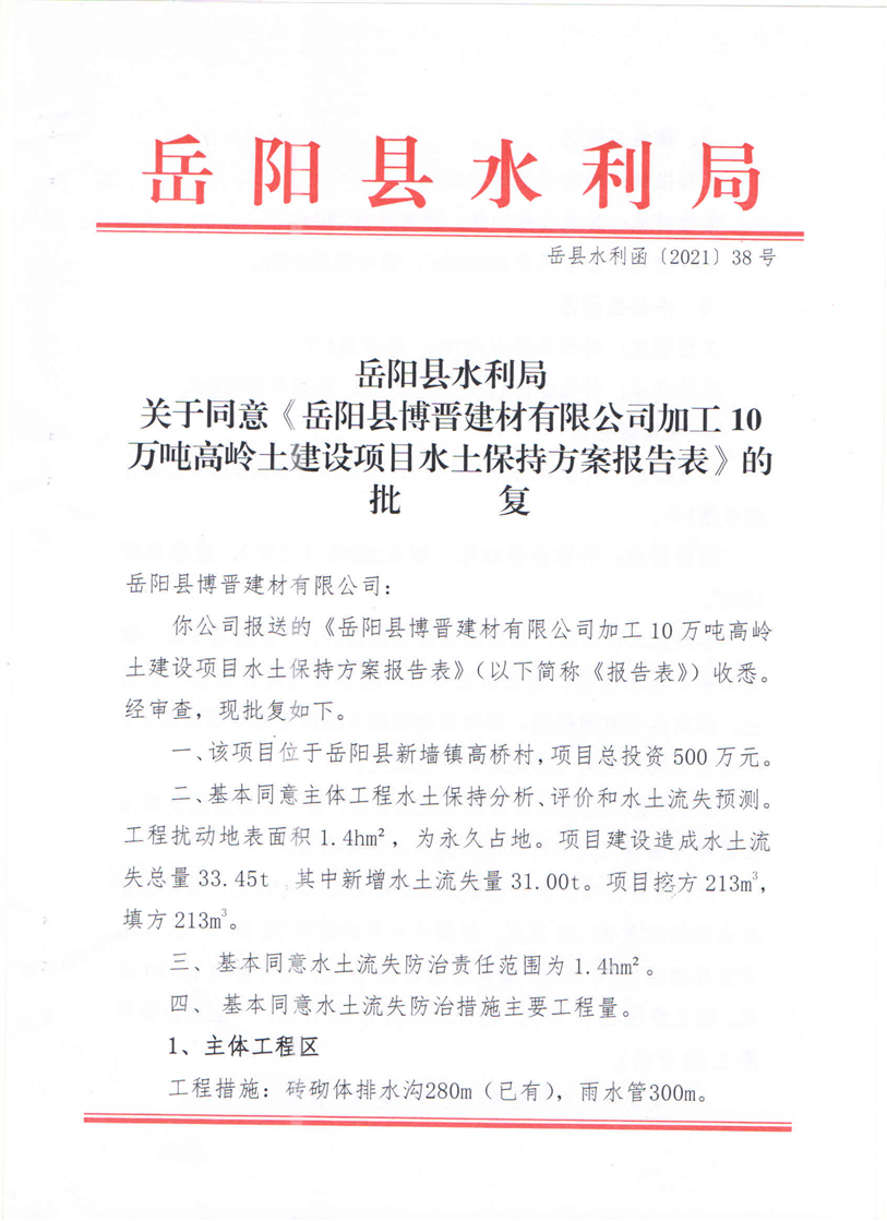 嶽陽縣水利局關於同意《嶽陽縣博晉建材有限公司加工10萬噸高嶺土建設項目水土保持方案報告表》的批複