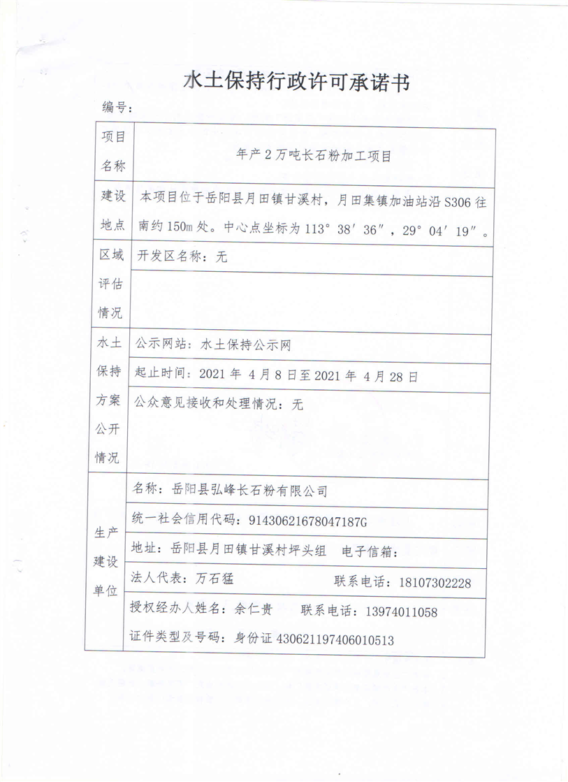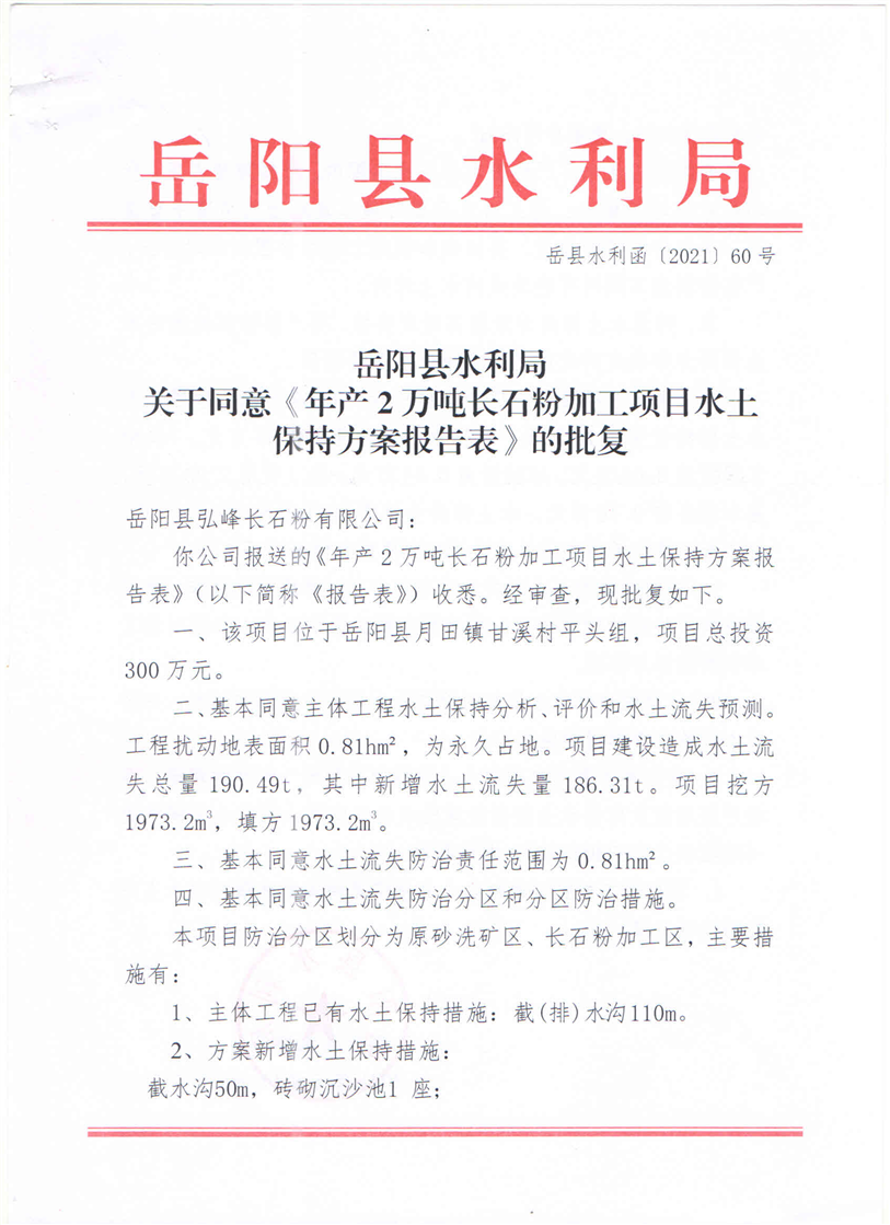嶽陽縣水利局關於同意《年產2萬噸長石粉加工項目水土保持方案報告表》的批複