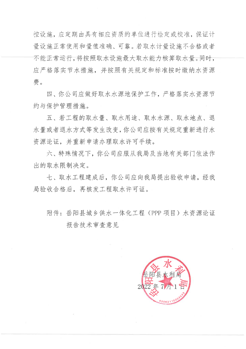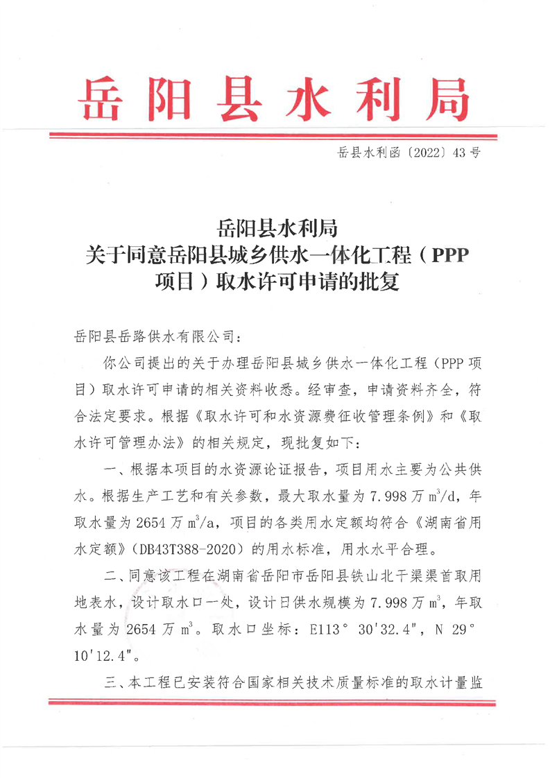 嶽陽縣水利局關於同意嶽陽縣城鄉供水一體化工程(PPP項目)取水許可申請的批複