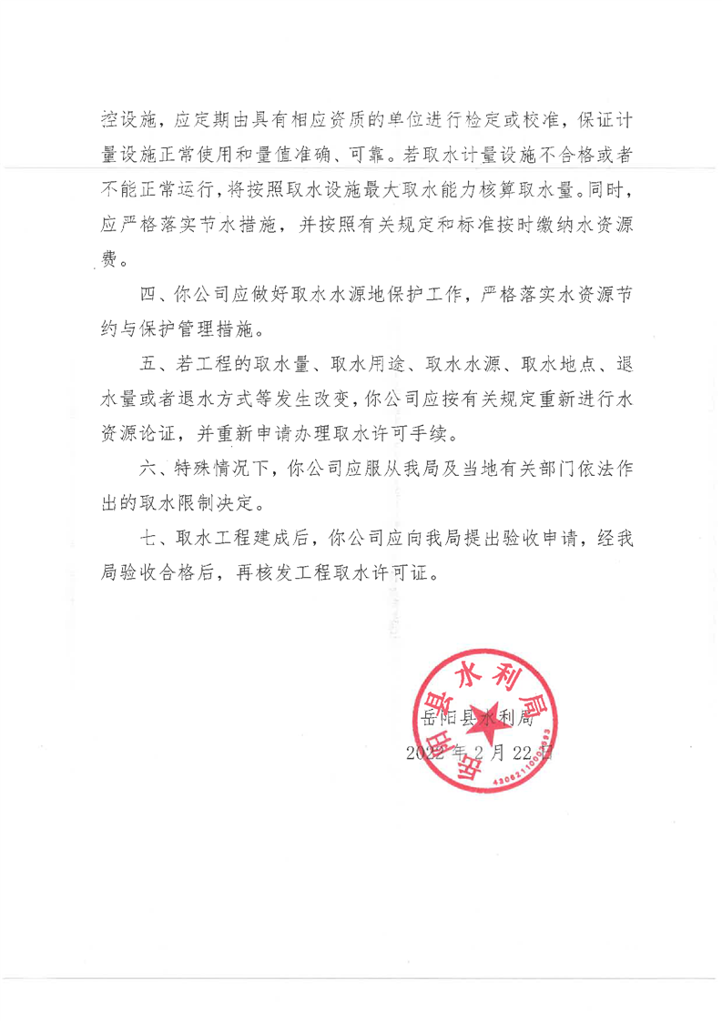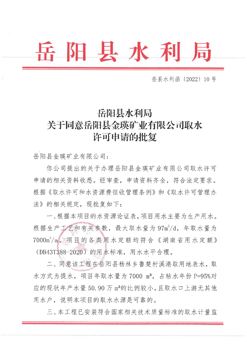 嶽陽縣水利局關於同意嶽陽縣金瑛礦業有限公司取水許可申請的批複
