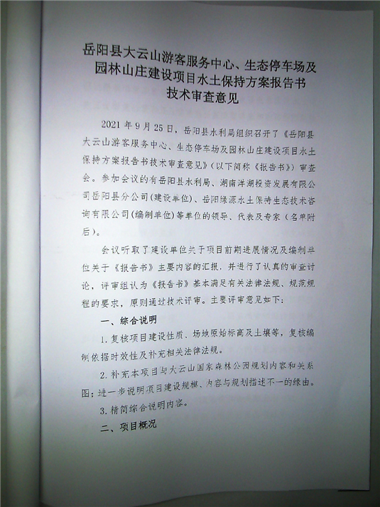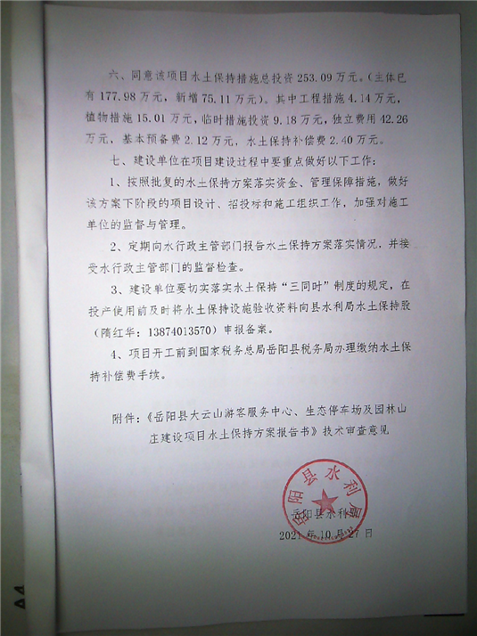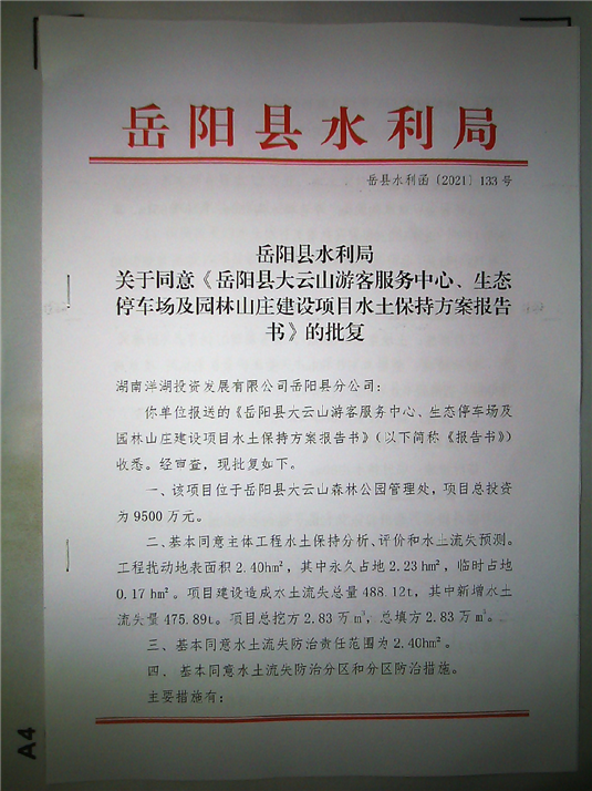 嶽陽縣水利局關於同意《嶽陽縣大雲山遊客服務中心、生態停車場及園林山莊建設項目水土保持方案報告書》的批複