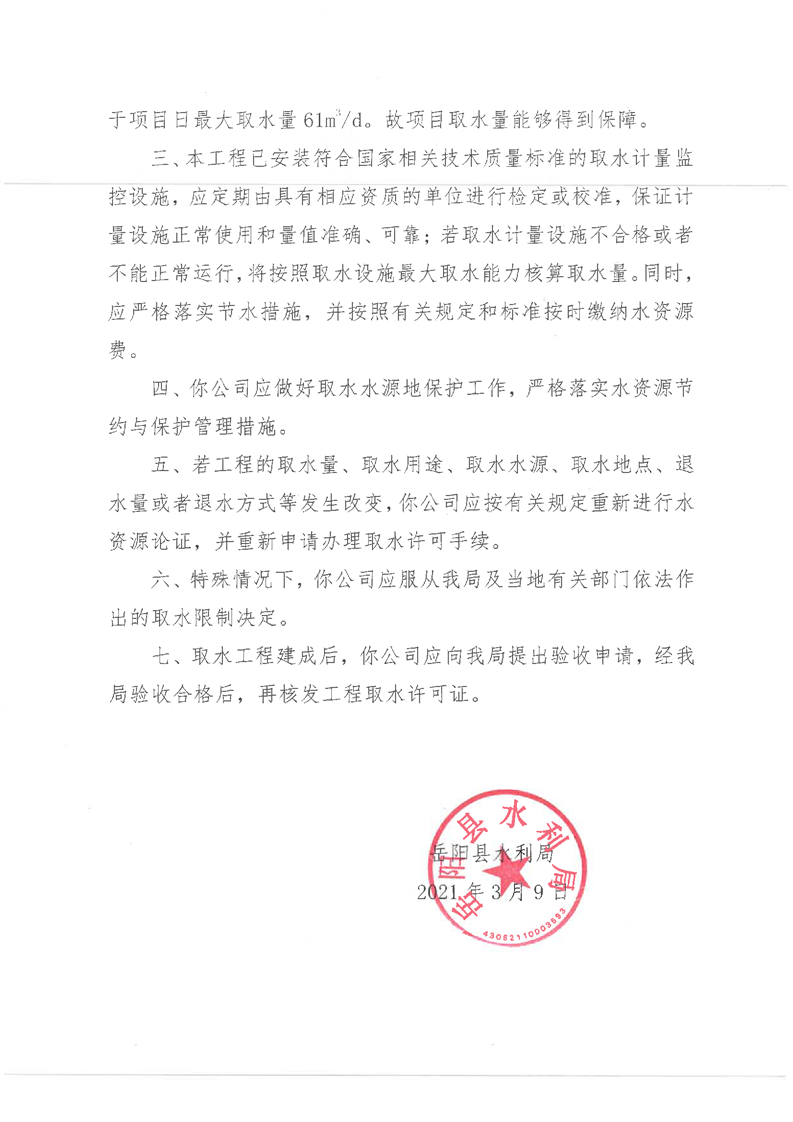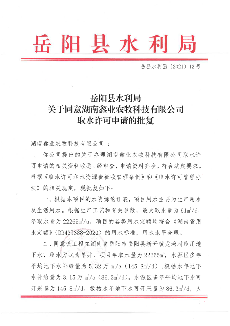 嶽陽縣水利局關於同意湖南鑫業農牧科技有限公司取水許可申請的批複
