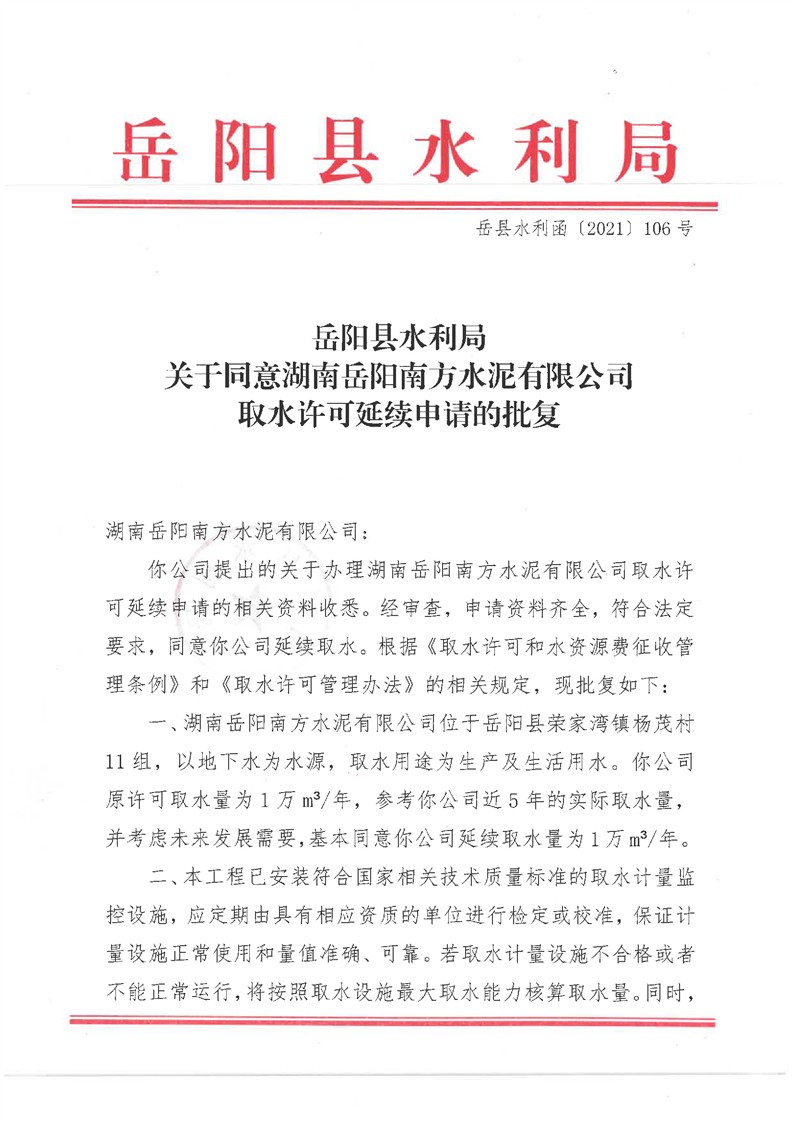 嶽陽縣水利局關於同意湖南嶽陽南方水泥有限公司取水許可延續申請的批複
