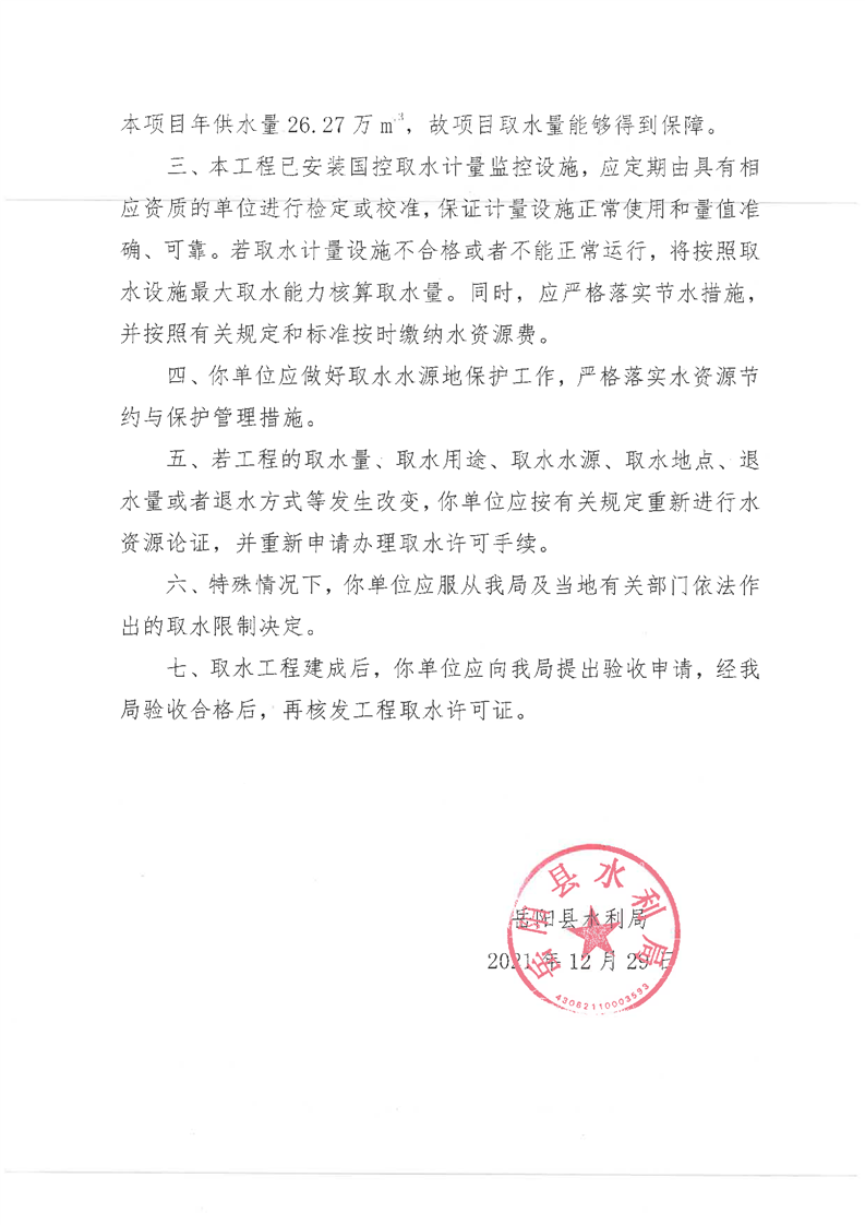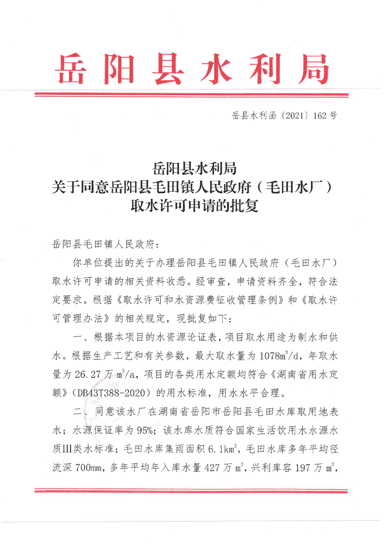 嶽陽縣水利局關於同意毛田鎮人民政府(毛田水廠)取水許可申請的批複