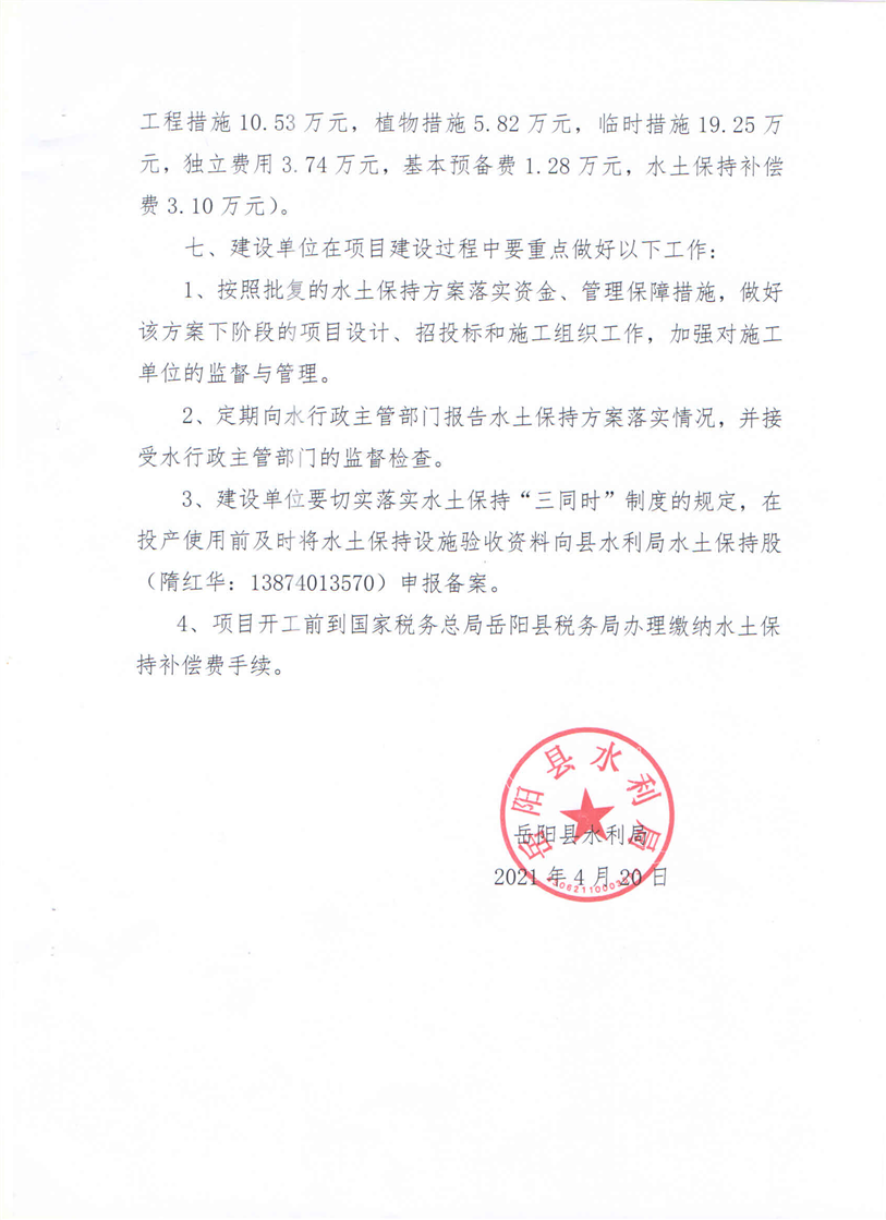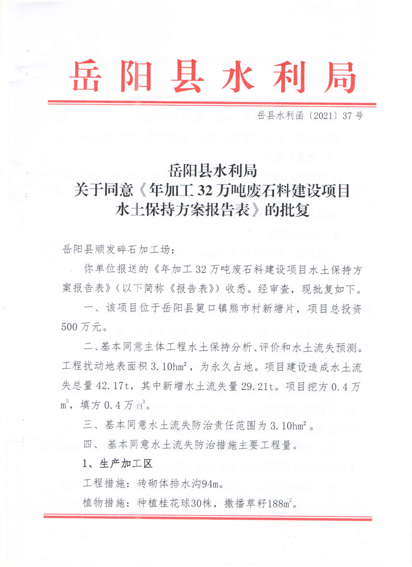 嶽陽縣水利局關於同意《年加工32萬噸廢石料建設項目水土保持方案報告表》的批複