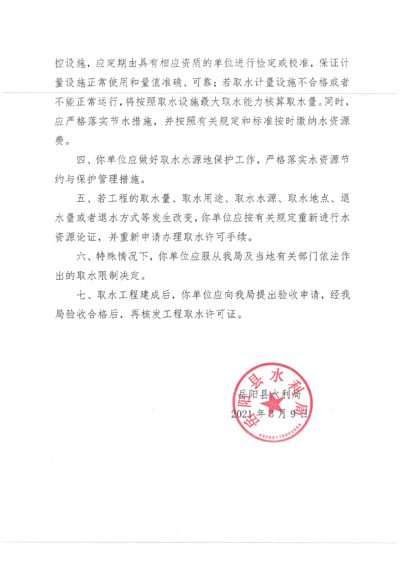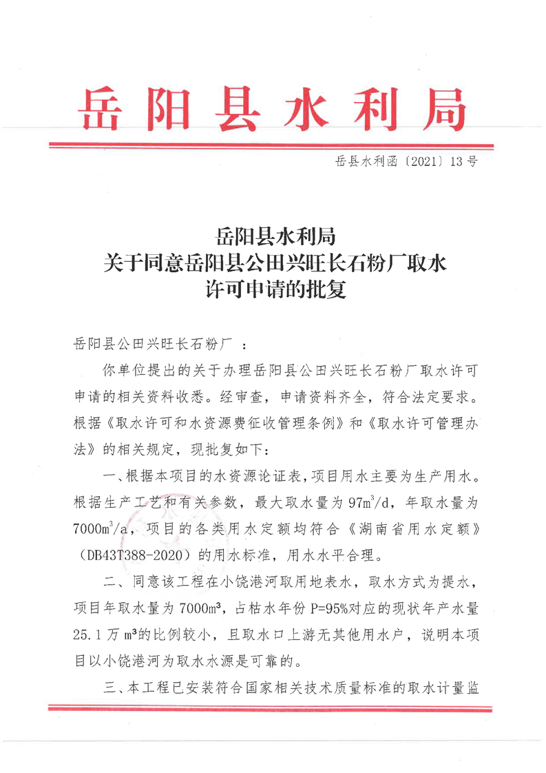 嶽陽縣水利局關於同意嶽陽縣公田興旺長石粉廠取水許可申請的批複
