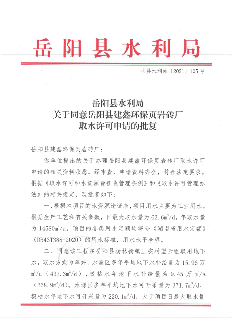 嶽陽縣水利局關於同意嶽陽縣建鑫環保頁岩磚廠取水許可申請的批複