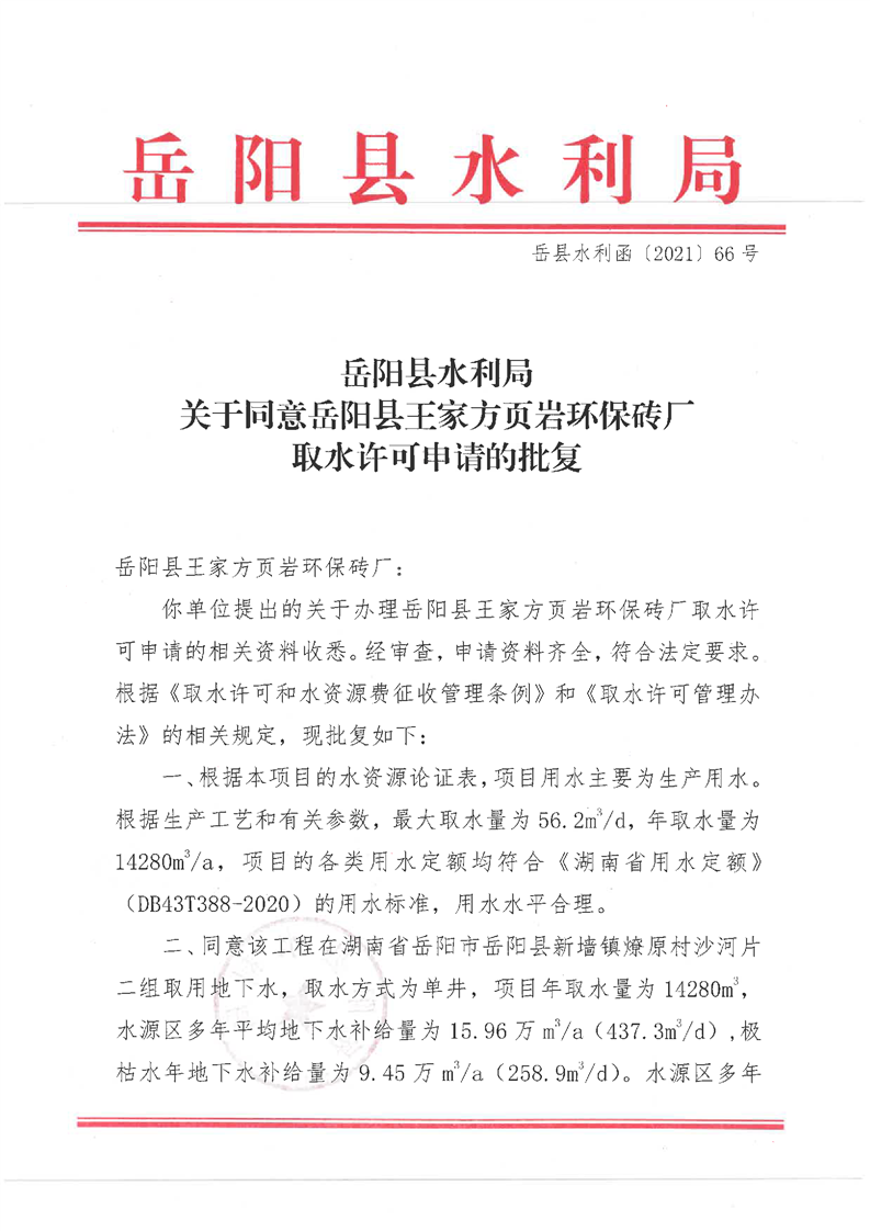 嶽陽縣水利局關於同意嶽陽縣王家方頁岩環保磚廠取水許可申請的批複
