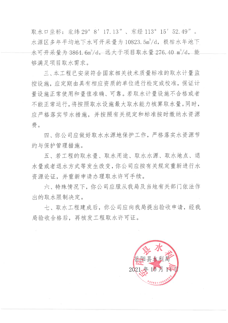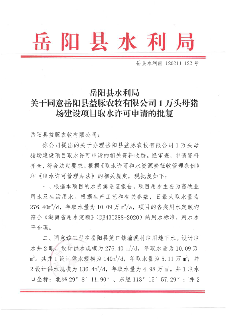 嶽陽縣水利局關於同意嶽陽縣益豚農牧有限公司1萬頭母豬場建設項目取水許可申請的批複