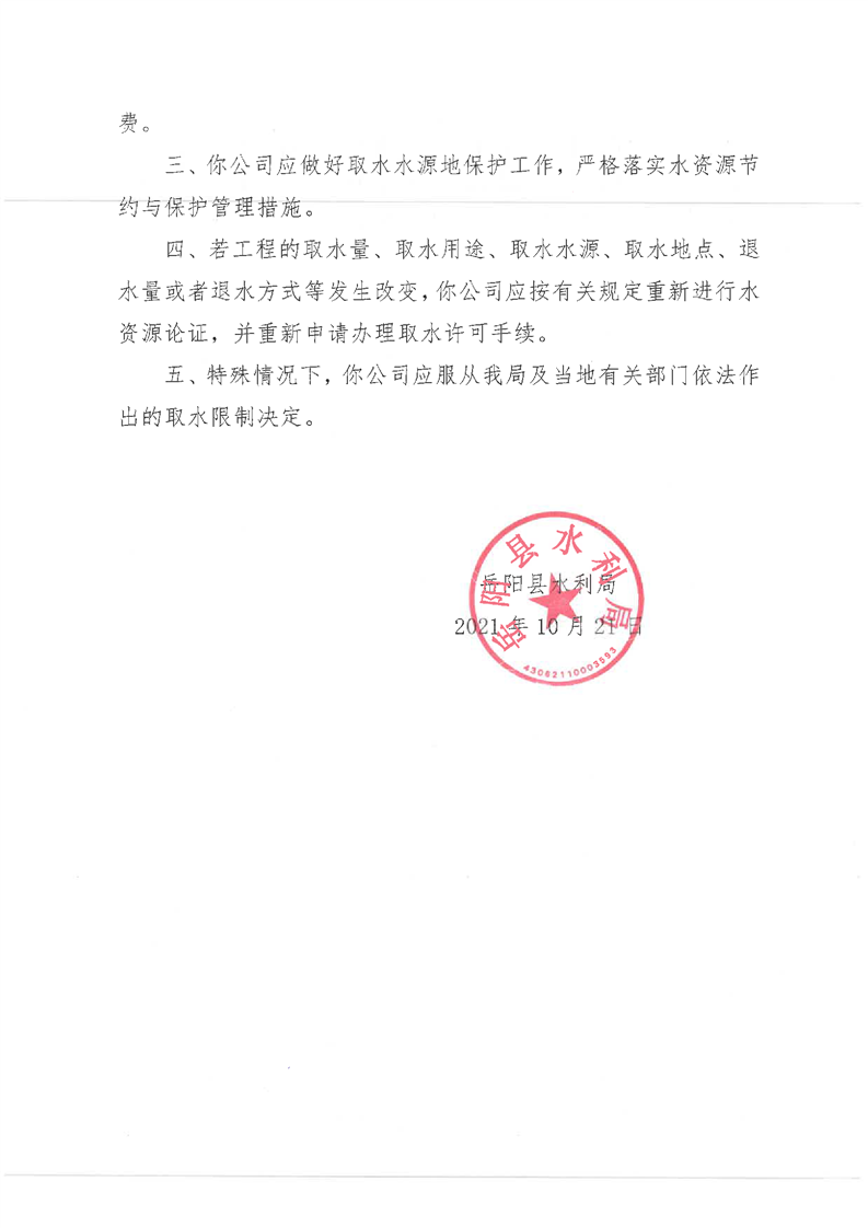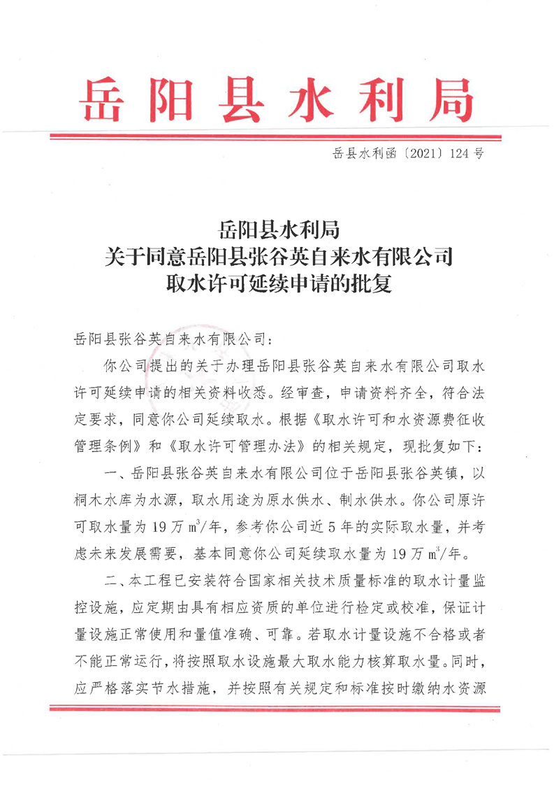 嶽陽縣水利局關於同意嶽陽縣張穀英自來水有限公司取水許可延續申請的批複