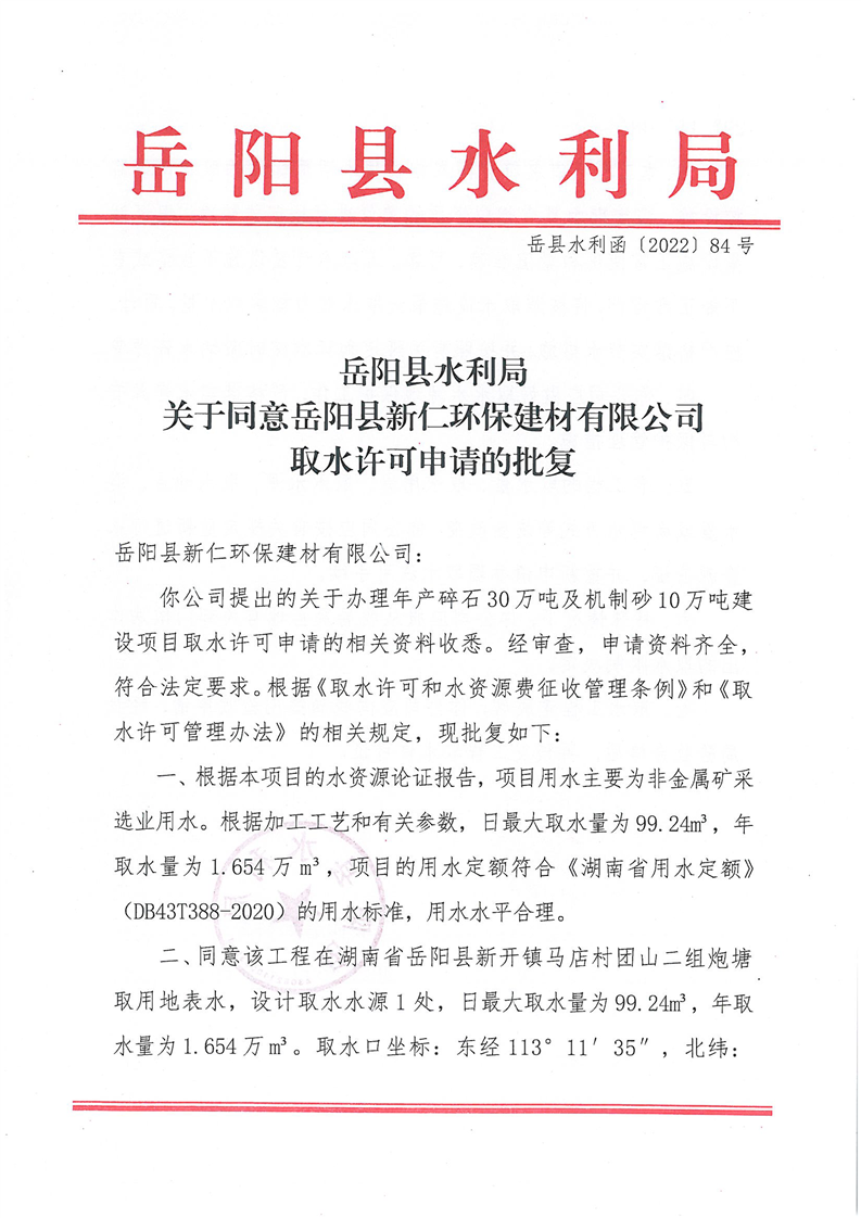 嶽陽縣水利局關於同意嶽陽縣新仁環保建材有限公司取水許可申請申請的批複
