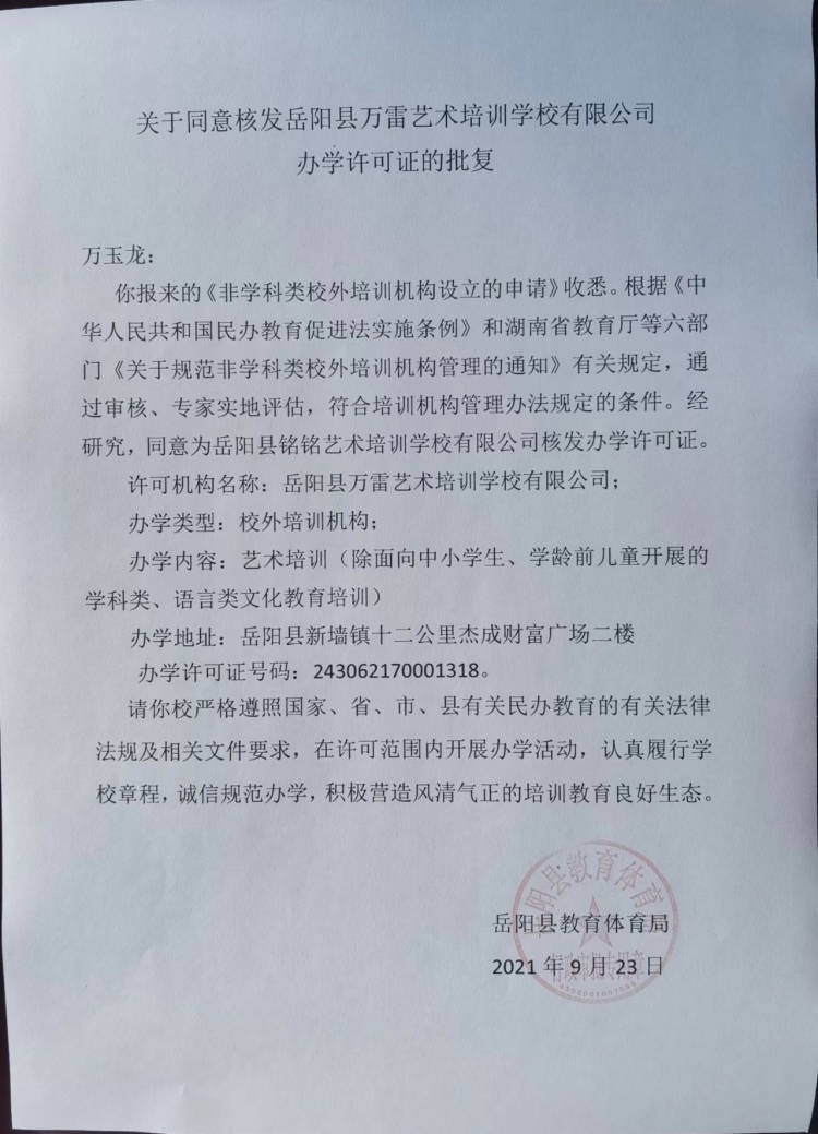 關於同意核發嶽陽縣萬雷藝術培訓學校有限公司辦學許可證的批複