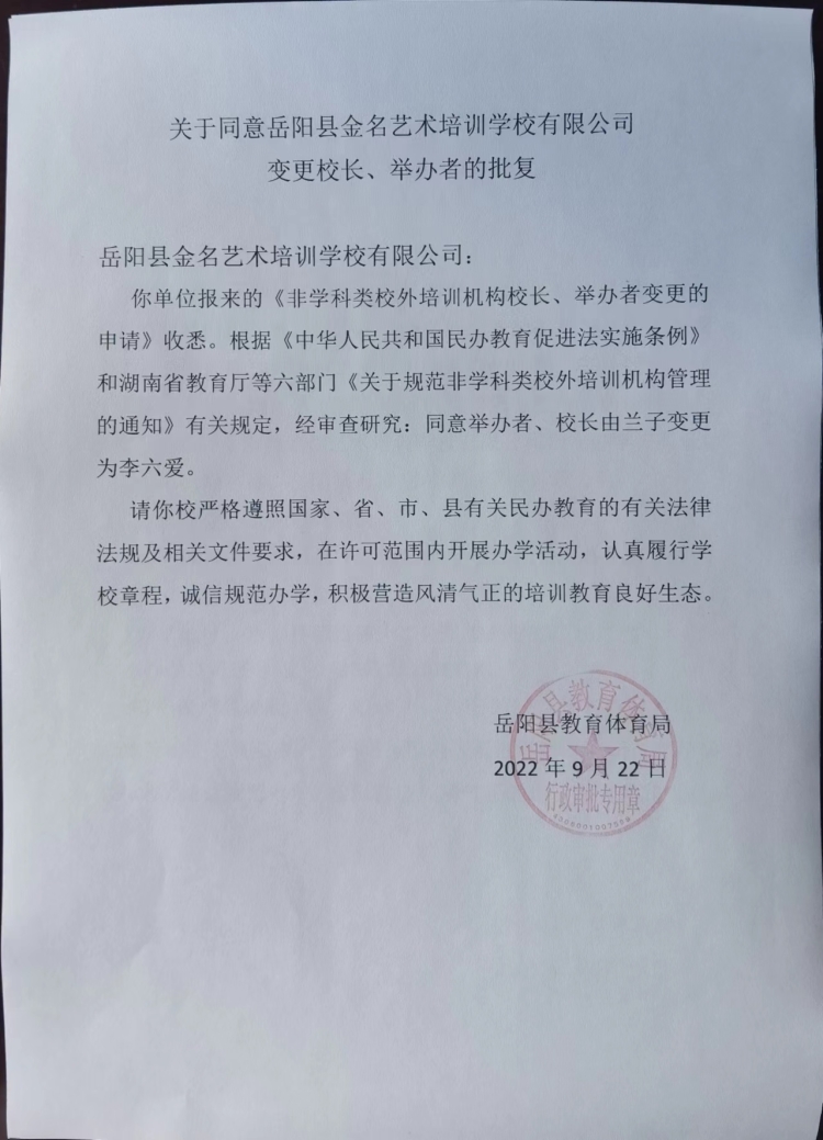 關於同意嶽陽縣金名藝術培訓學校有限公司變更校長、舉辦者的批複