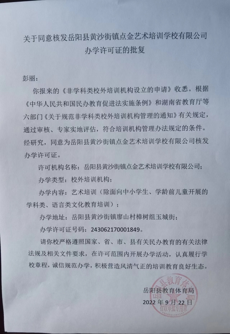 關於同意核發嶽陽縣黃沙街鎮點金藝術培訓學校有限公司辦學許可證的批複