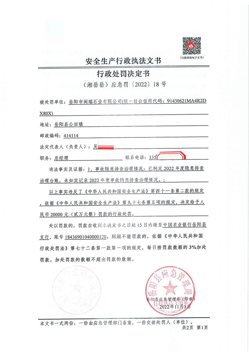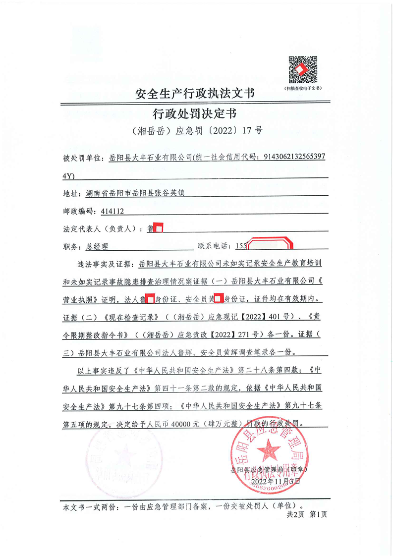 嶽陽縣應急管理局:安全生產行政處罰決定公示(11月第一批)